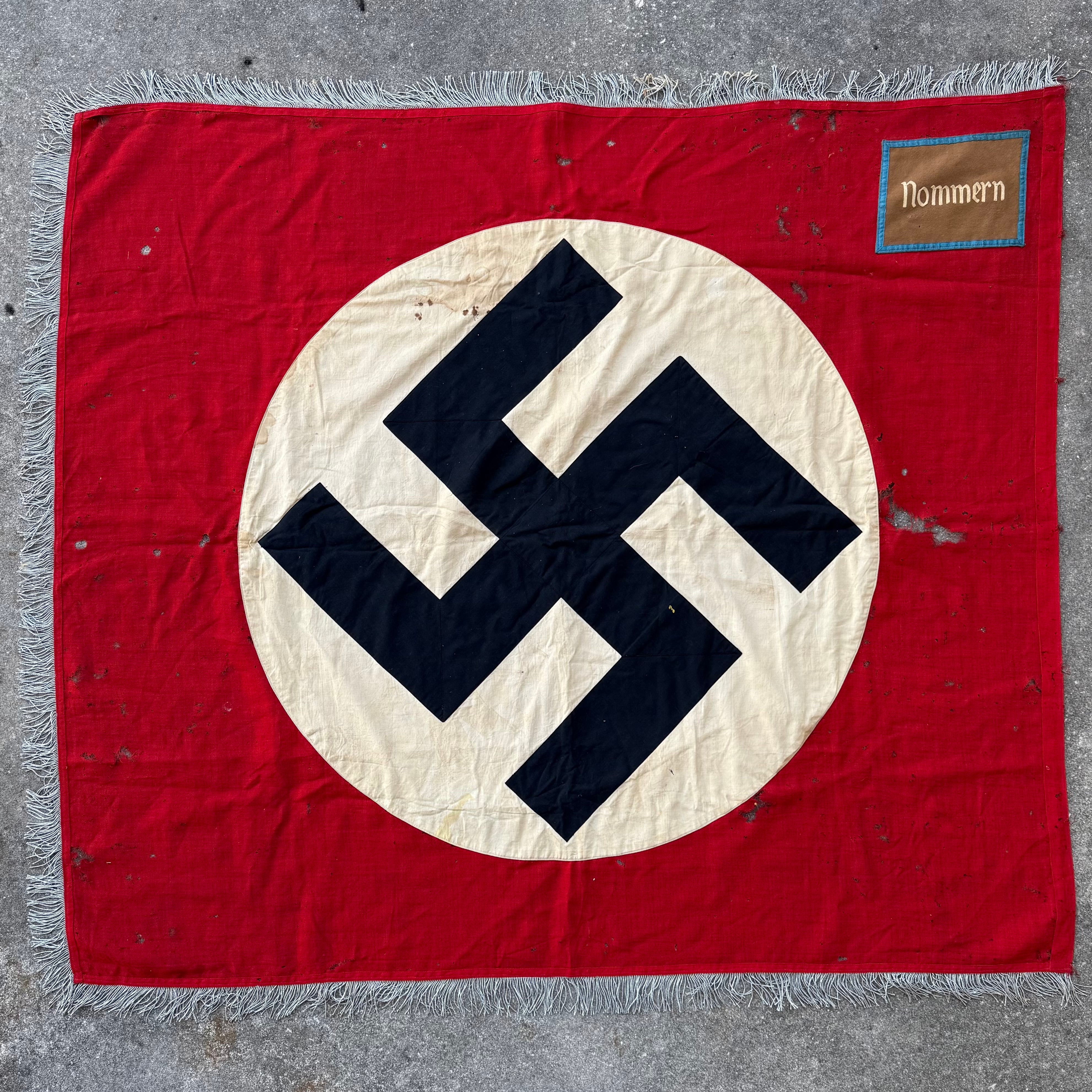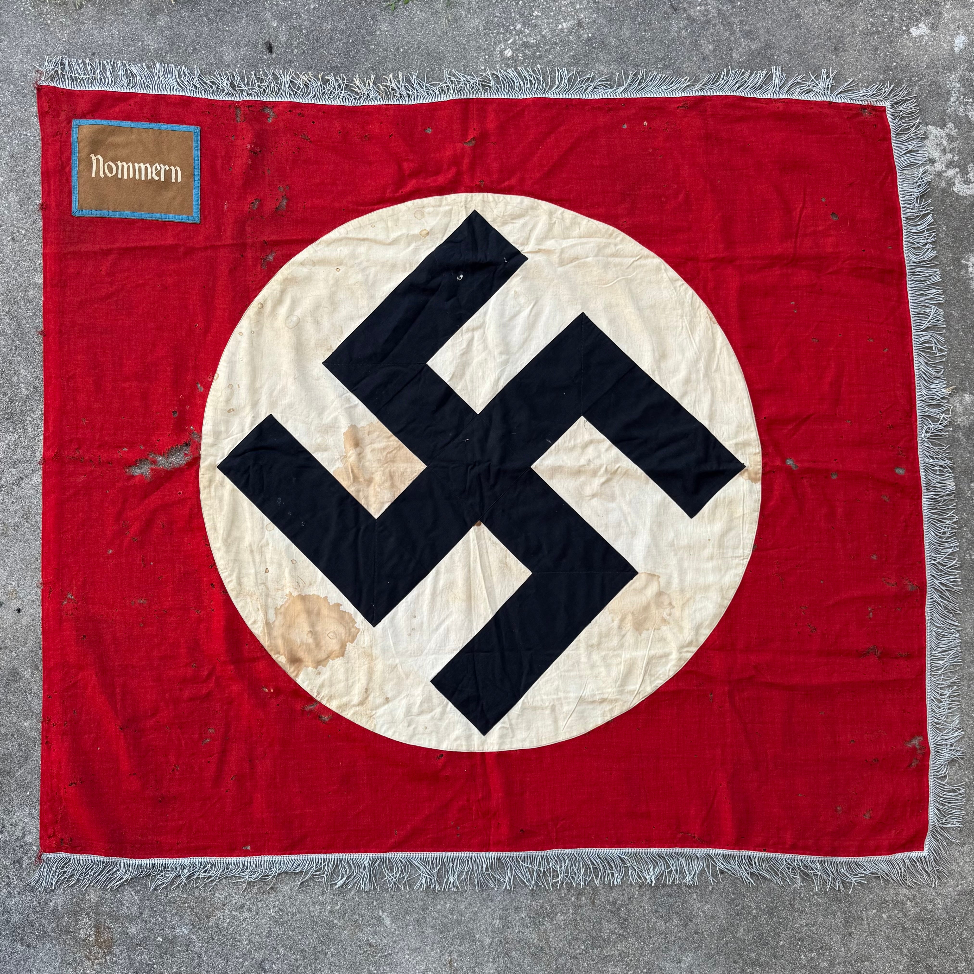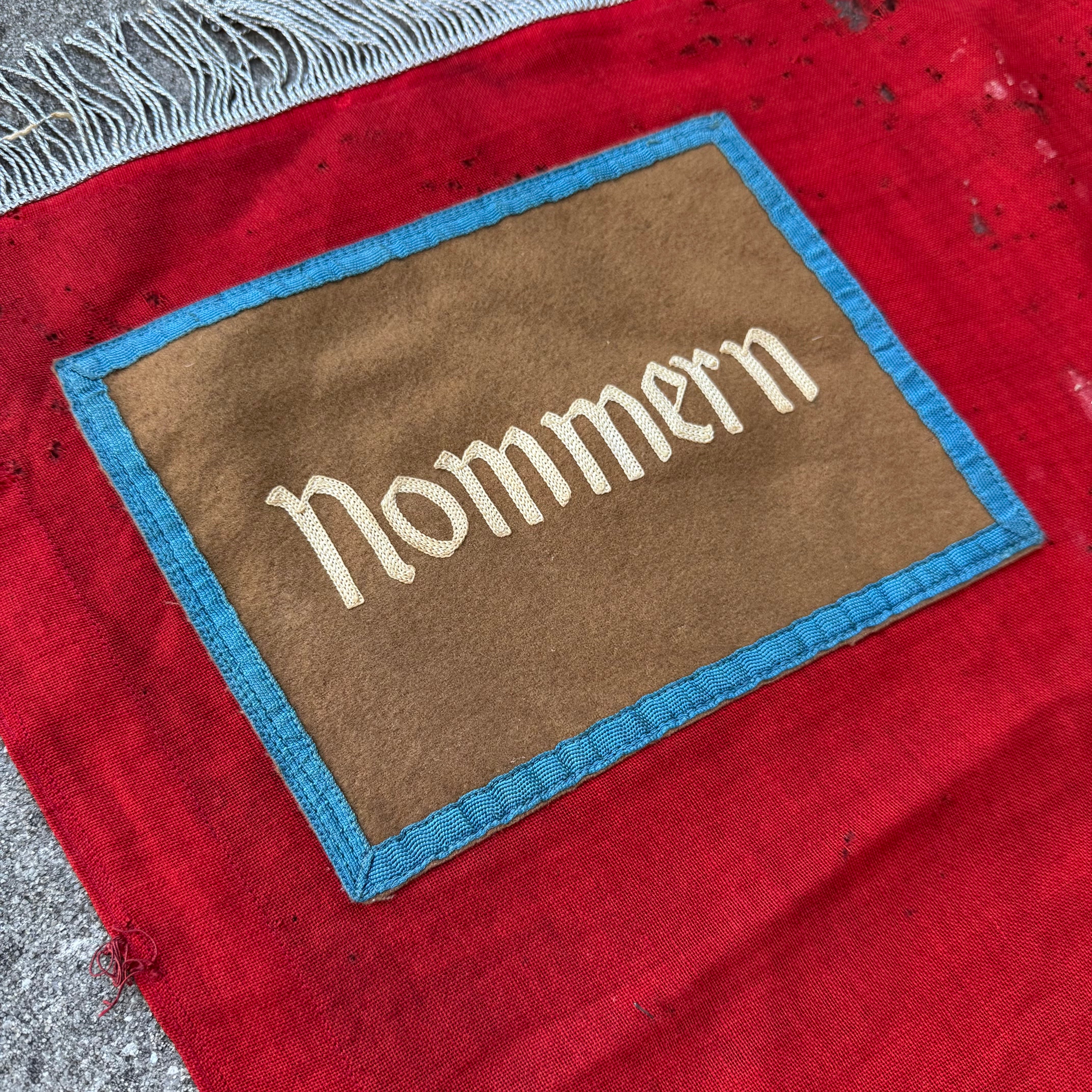 Original World War Two German NSDAP Ortsgruppe Standarte. Quality made, double sided NSDAP standarte with township “Nommern” chain stitched in the top corners on both sides. This standarte is red wool, and has silver fringe to three sides. The center is a multi-section swastika, static design. There is some water damage and holes throughout. The city patch is blue piped for Ortsgruppen with a tan center and the name of the city “Nommern” chain stitched into it.