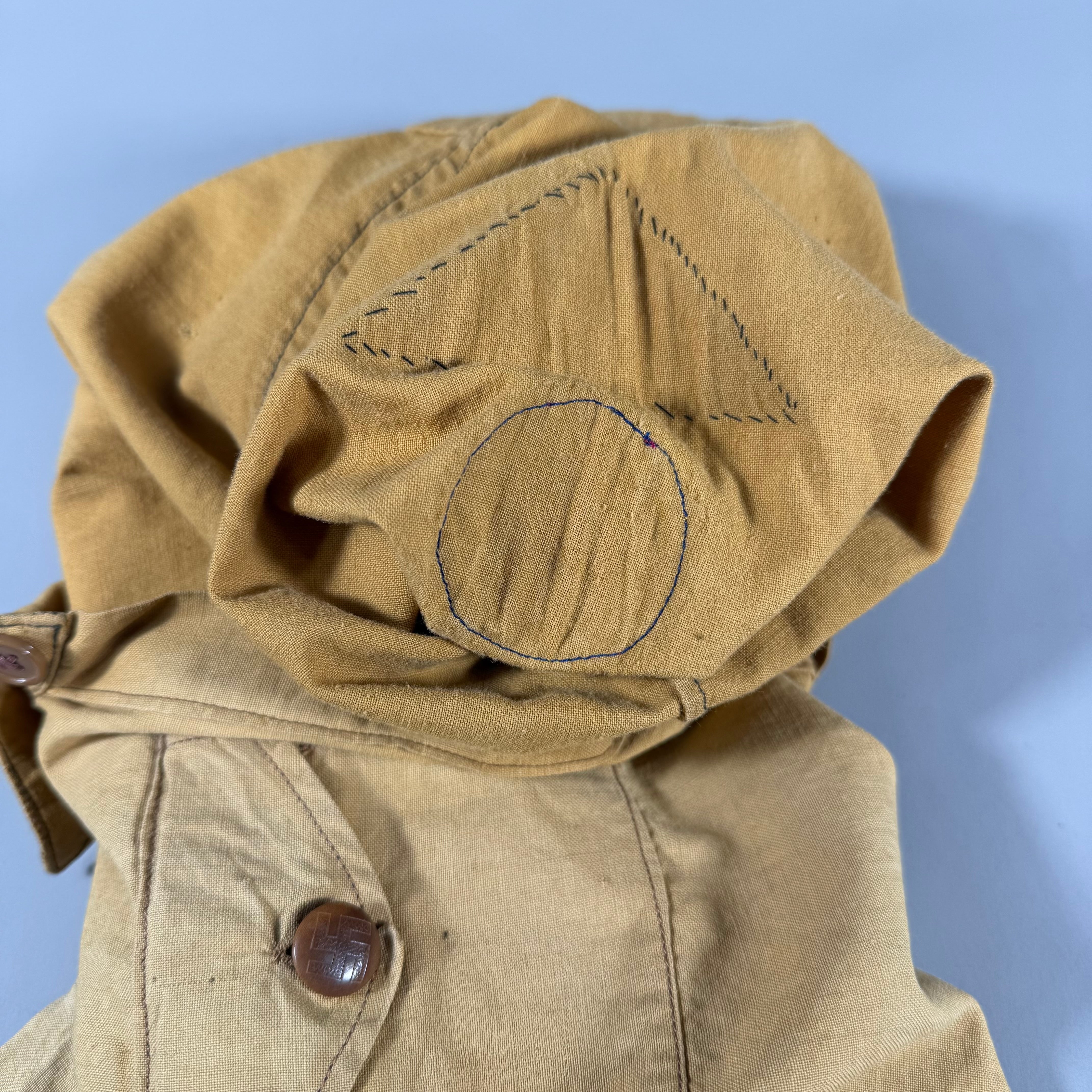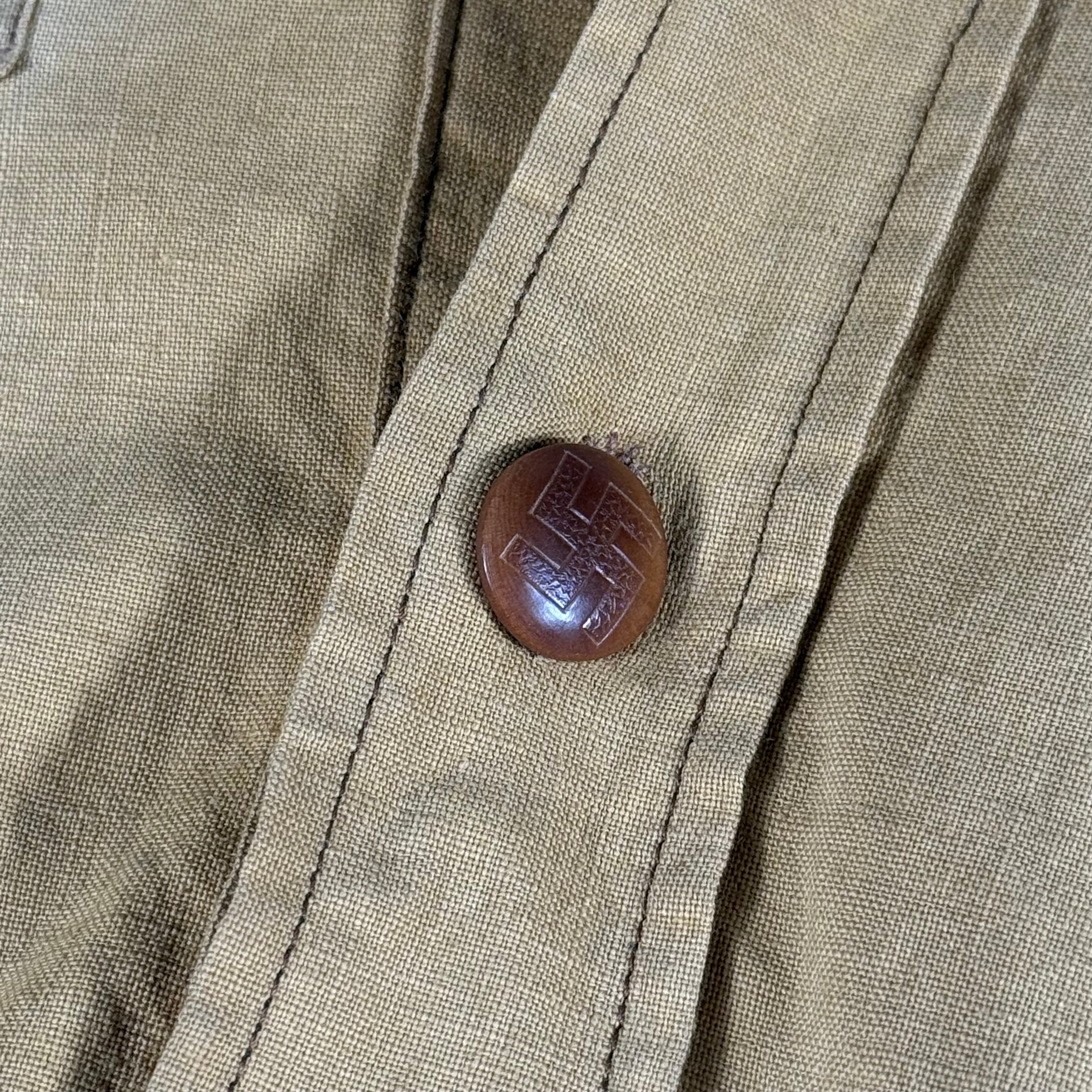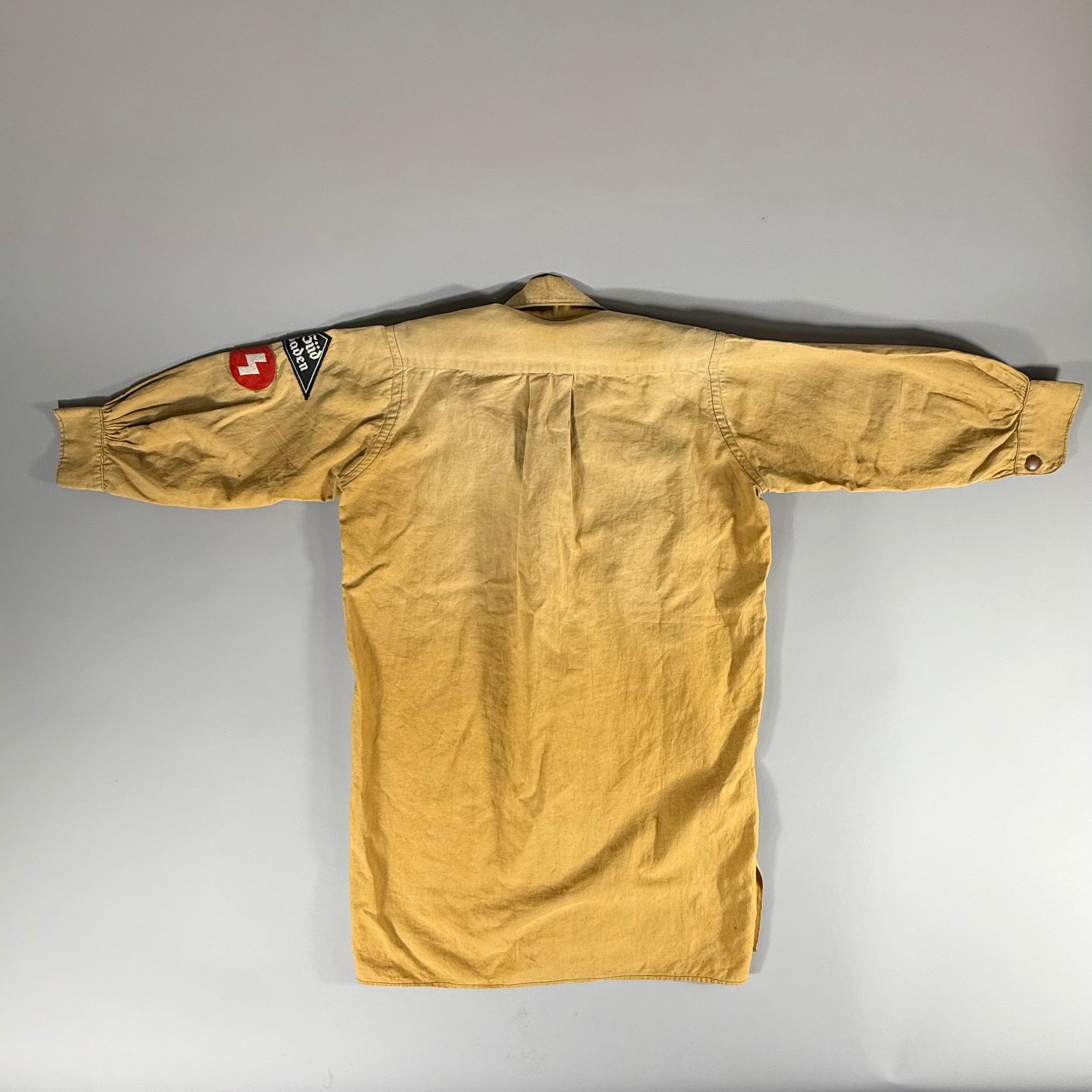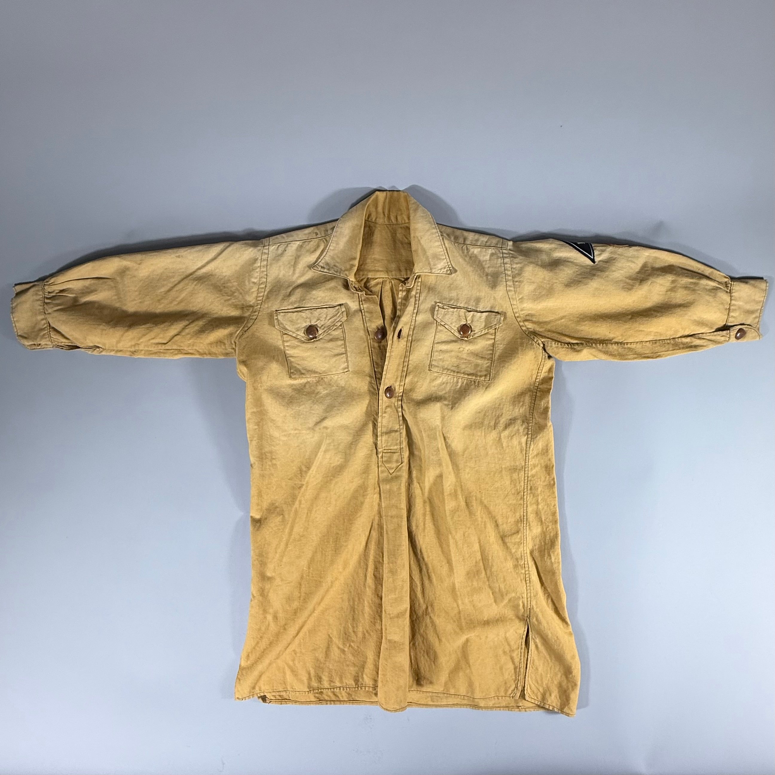 Prior to 1925, an assortment of uniform items were worn by "Hitler Jugend" members, mainly consisting of a white shirt and HJ armband. In an attempt to associate themselves more closely with the Nazi Party, the HJ and DJ adopted the NSDAP brown shirt in 1925. In August of 1935 the 1933 pattern HJ/DJ service shirt was replaced with a waist-length blouse, constructed of a heavier cotton twill, being more of a tunic than a shirt. Tan-colored cotton/rayon twill, long-sleeved, three-quarter-length pull-over shirt with a three button front with a lay down collar. A pleated patch pocket with a scalloped button-down flap, is to each breast, as well as, fold-back, pleated French cuffs. The Buttons feature a unique Swastika pattern.