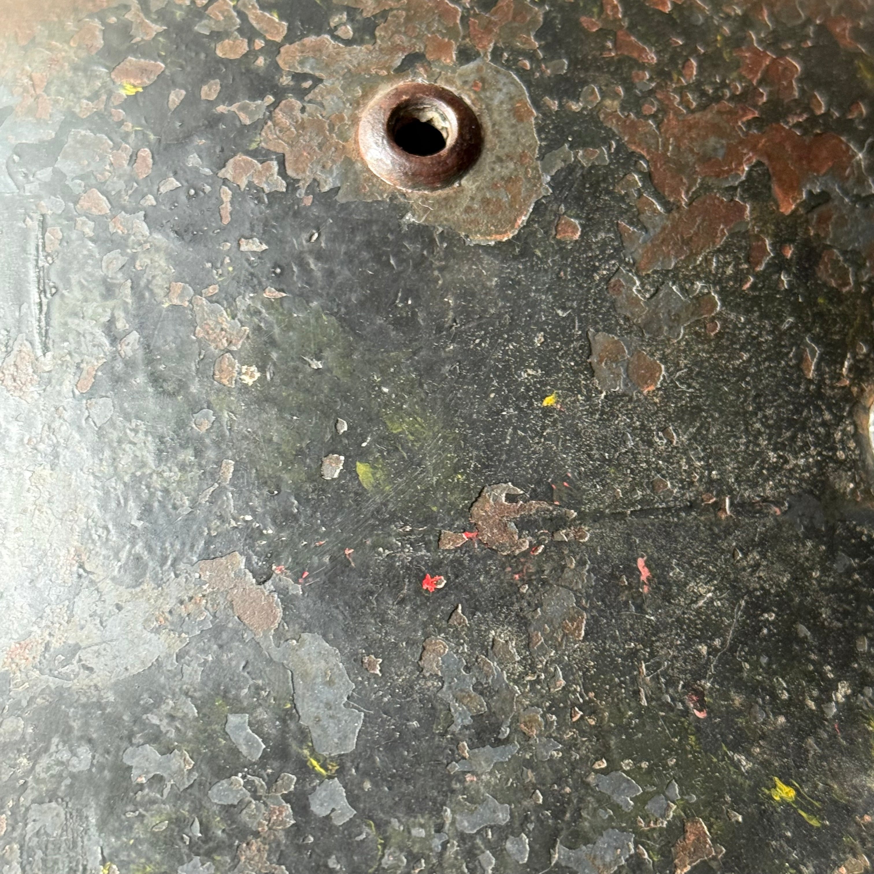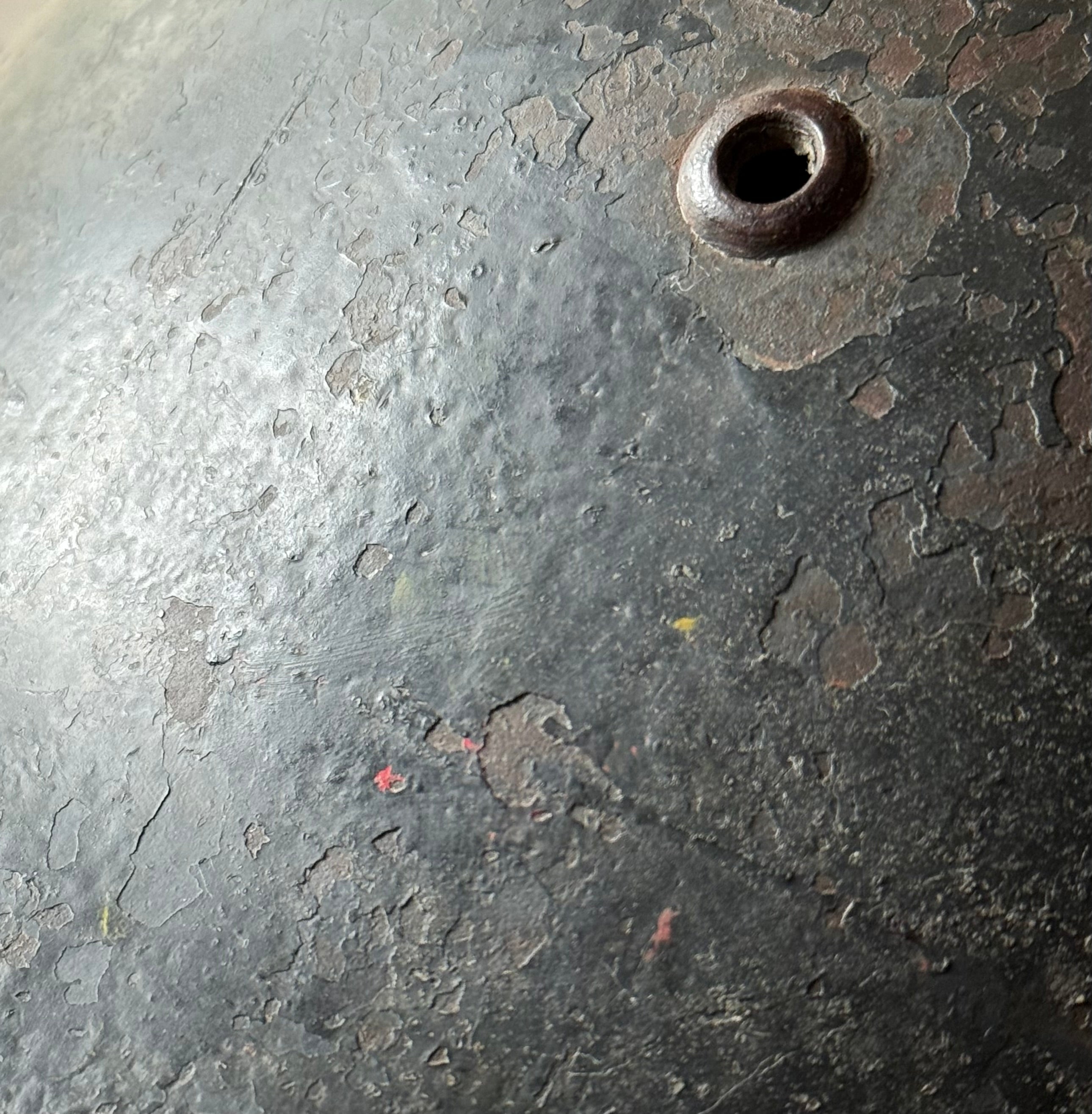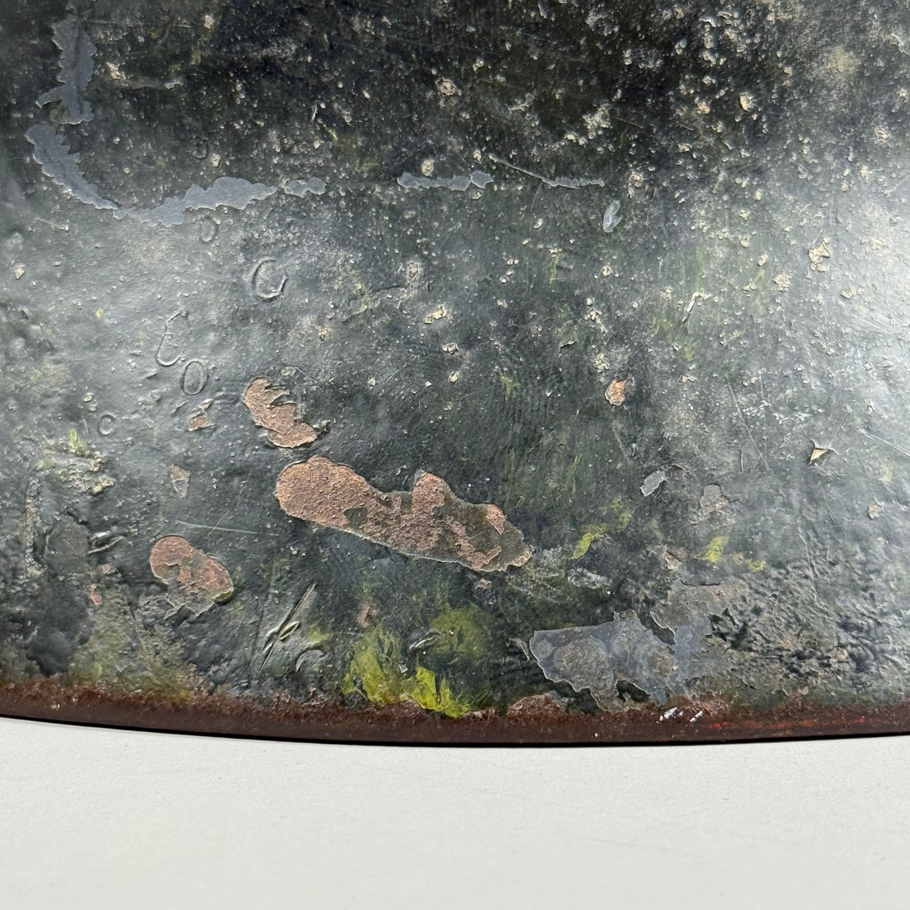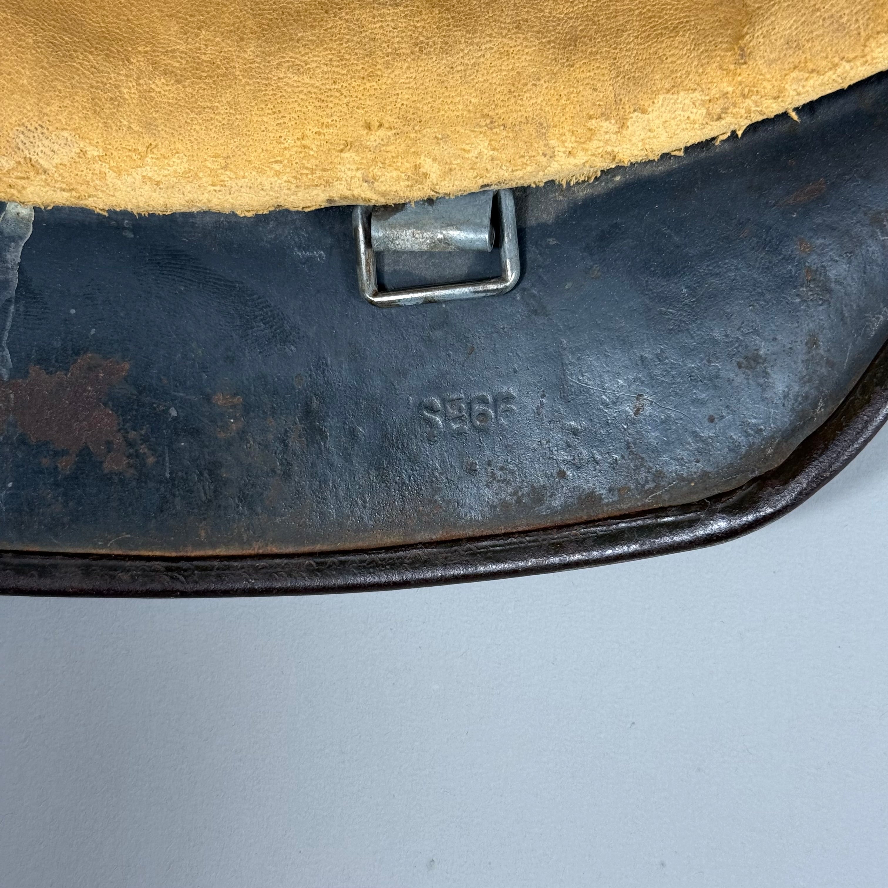 Really interesting Lid featuring a Dark-Green overpaint over both decals that can still be seen underneath the paint as well as thick indent lines within the paint where a wire sat when the helmet was painted. Underneath the green tones the Luftwaffe Blue can still be seen. The bulging and outlines of the Luftwaffe Adler can be seen, as well as its tail feathers, the tricolor decal can still be seen underneath the paint as well where small portions of the red are seen. The pig skin liner is in excellent condition and marked 58 on one of the tongues and underneath is also a factory code number. The skirt of the lid itself also still retains the helmet factory code as well as the maker and size code; SE66 indicating manufacture by Sächsische Emaillier-und Stanzwerke, AG Lauter, size 66. Unfortunately no chin strap on this one.