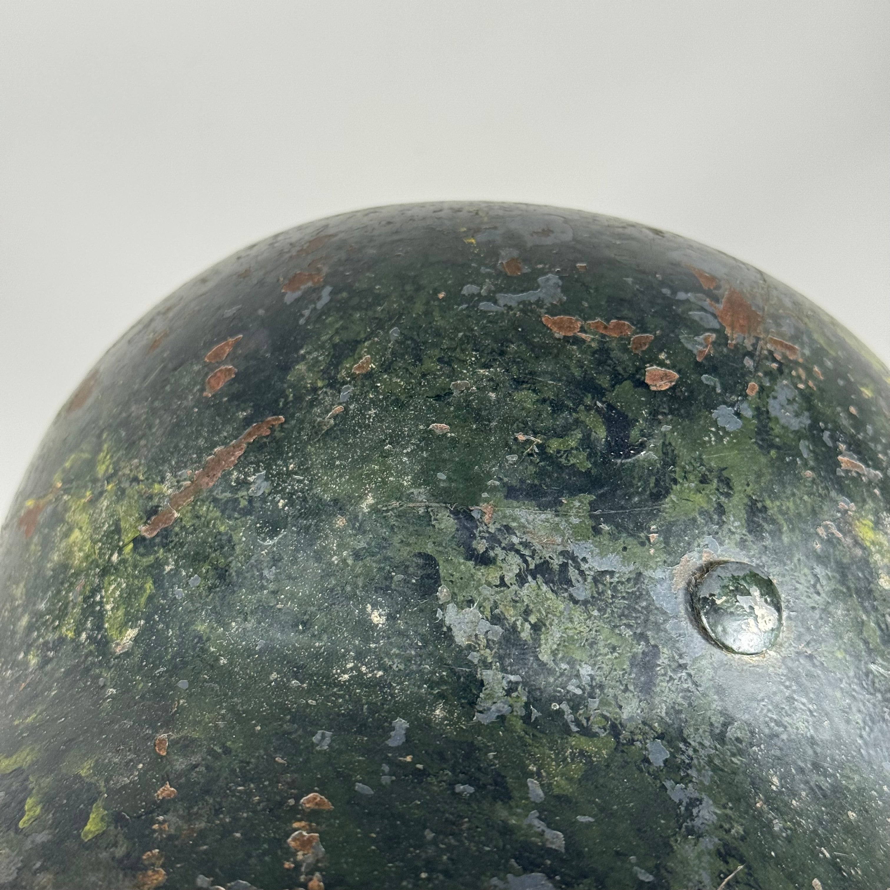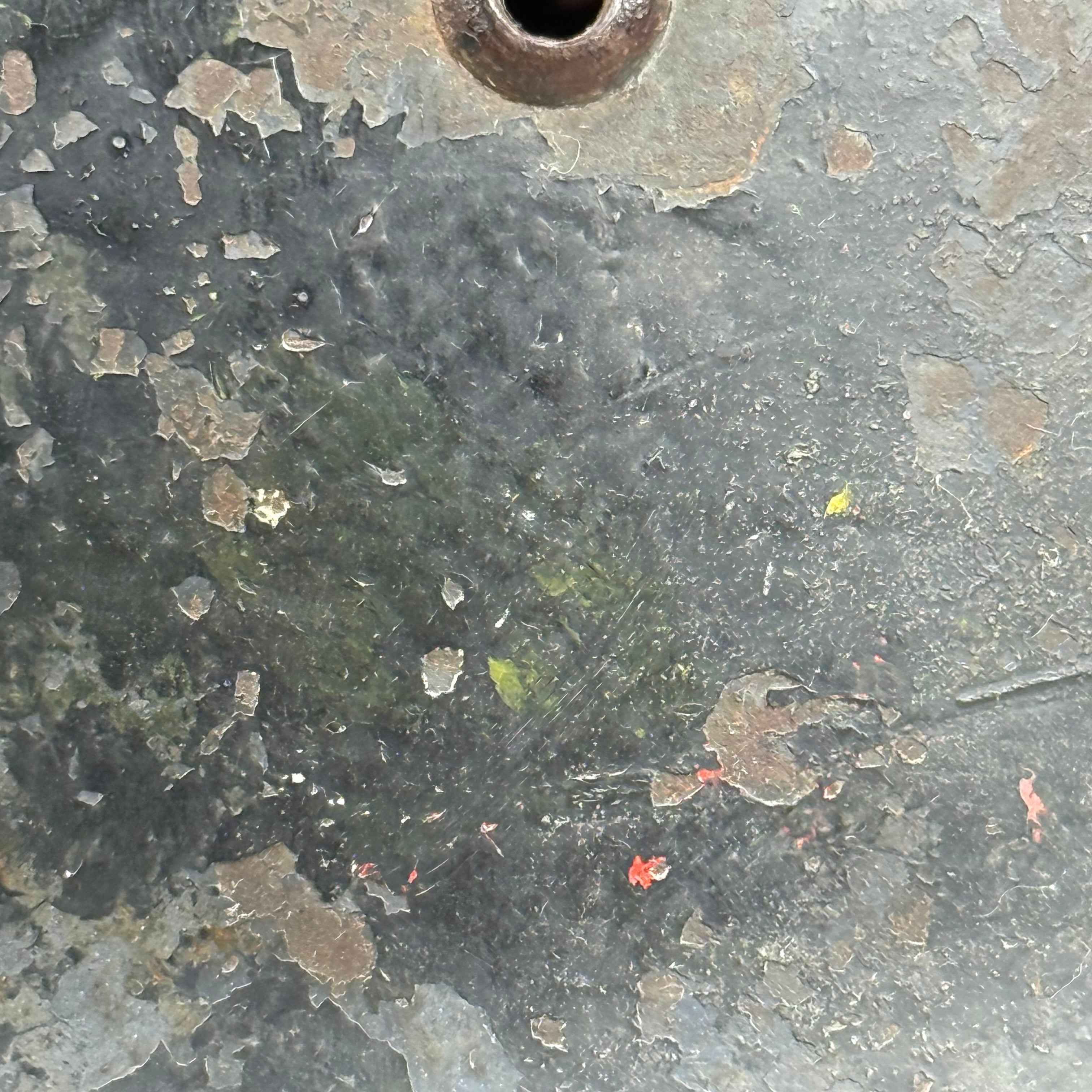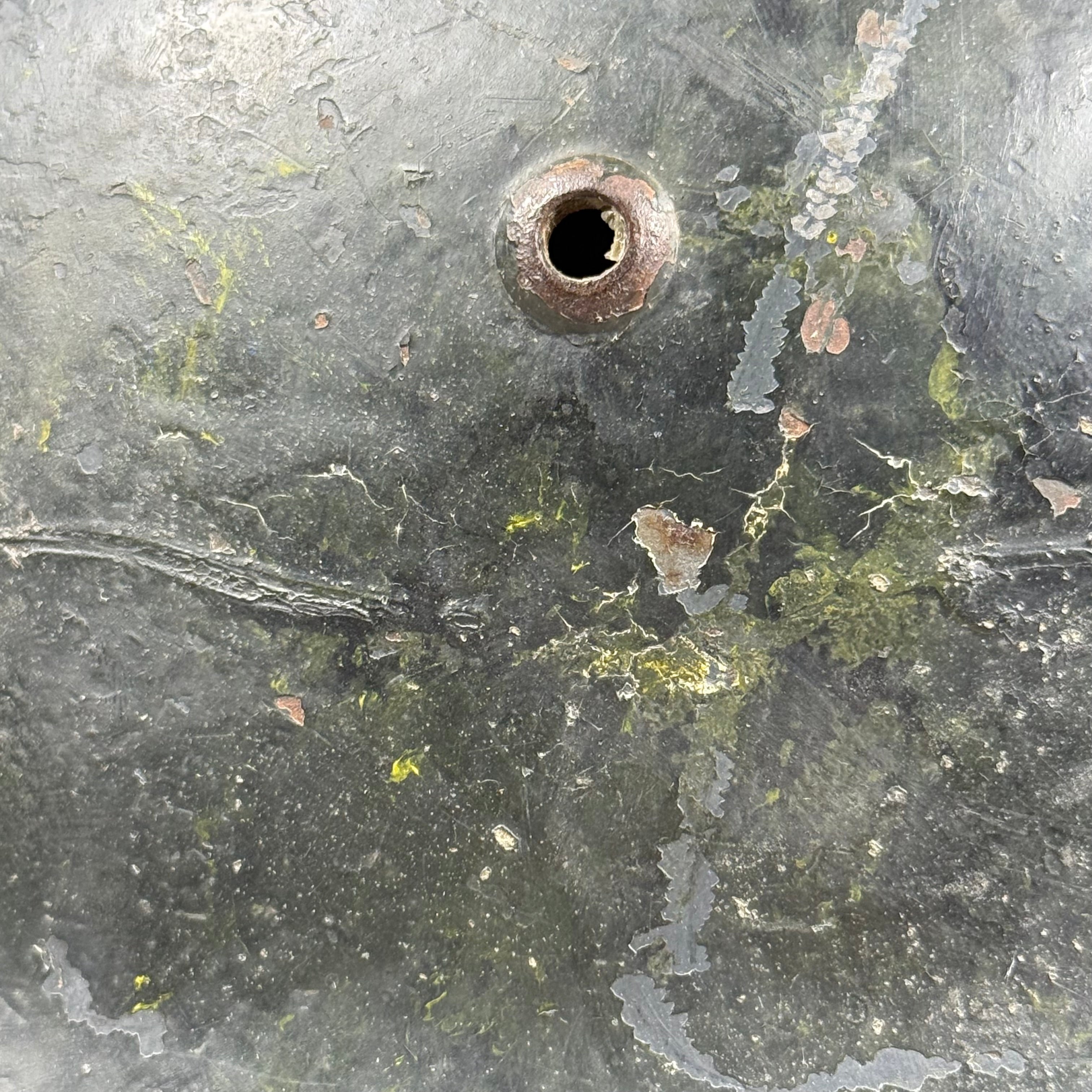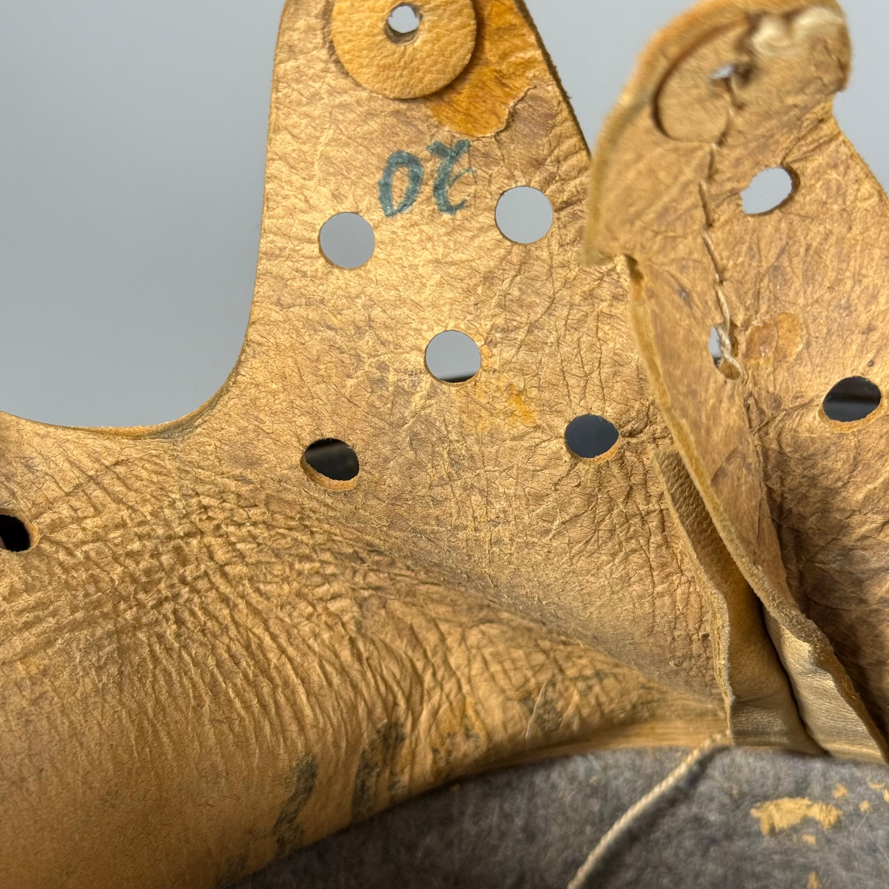 Really interesting Lid featuring a Dark-Green overpaint over both decals that can still be seen underneath the paint as well as thick indent lines within the paint where a wire sat when the helmet was painted. Underneath the green tones the Luftwaffe Blue can still be seen. The bulging and outlines of the Luftwaffe Adler can be seen, as well as its tail feathers, the tricolor decal can still be seen underneath the paint as well where small portions of the red are seen. The pig skin liner is in excellent condition and marked 58 on one of the tongues and underneath is also a factory code number. The skirt of the lid itself also still retains the helmet factory code as well as the maker and size code; SE66 indicating manufacture by Sächsische Emaillier-und Stanzwerke, AG Lauter, size 66. Unfortunately no chin strap on this one.