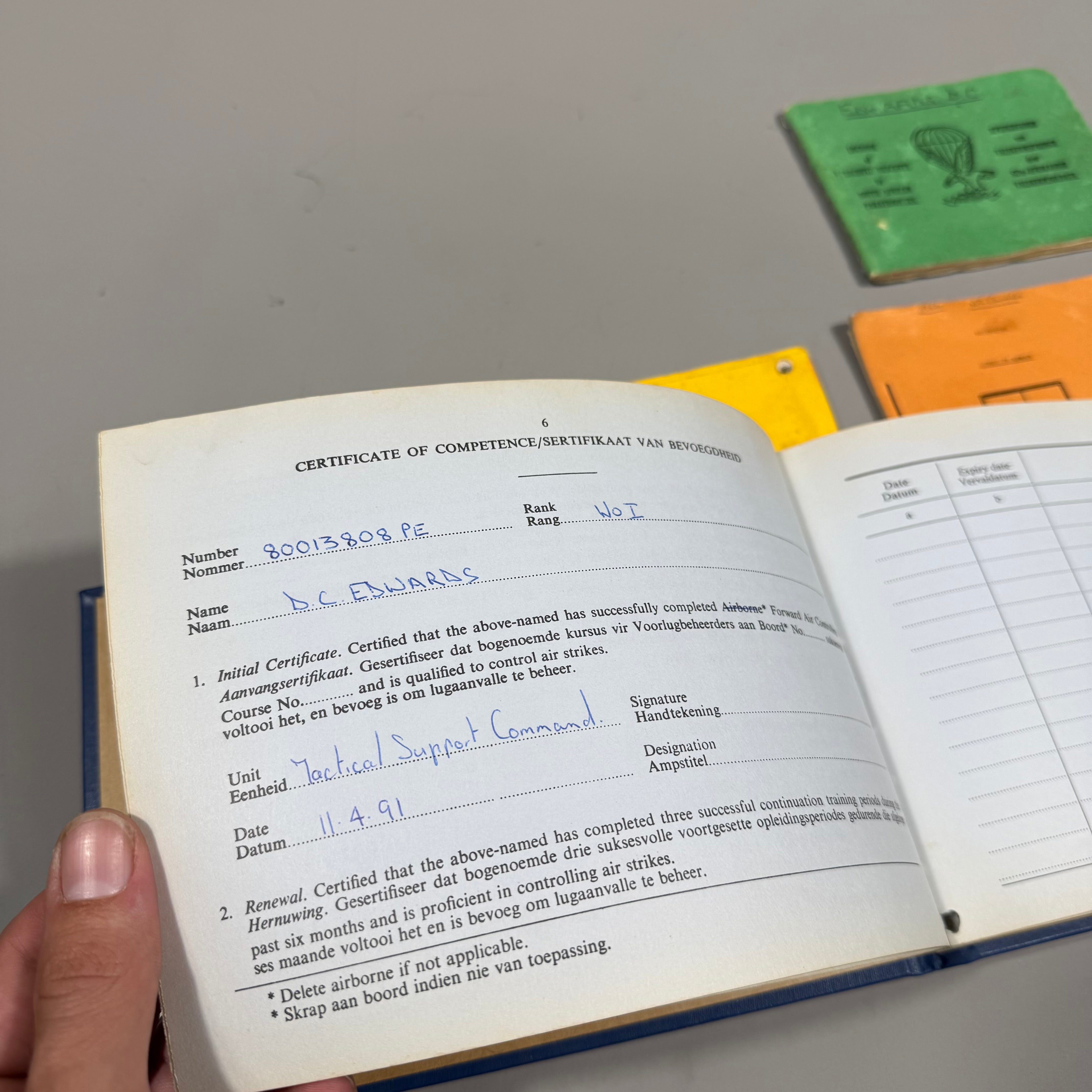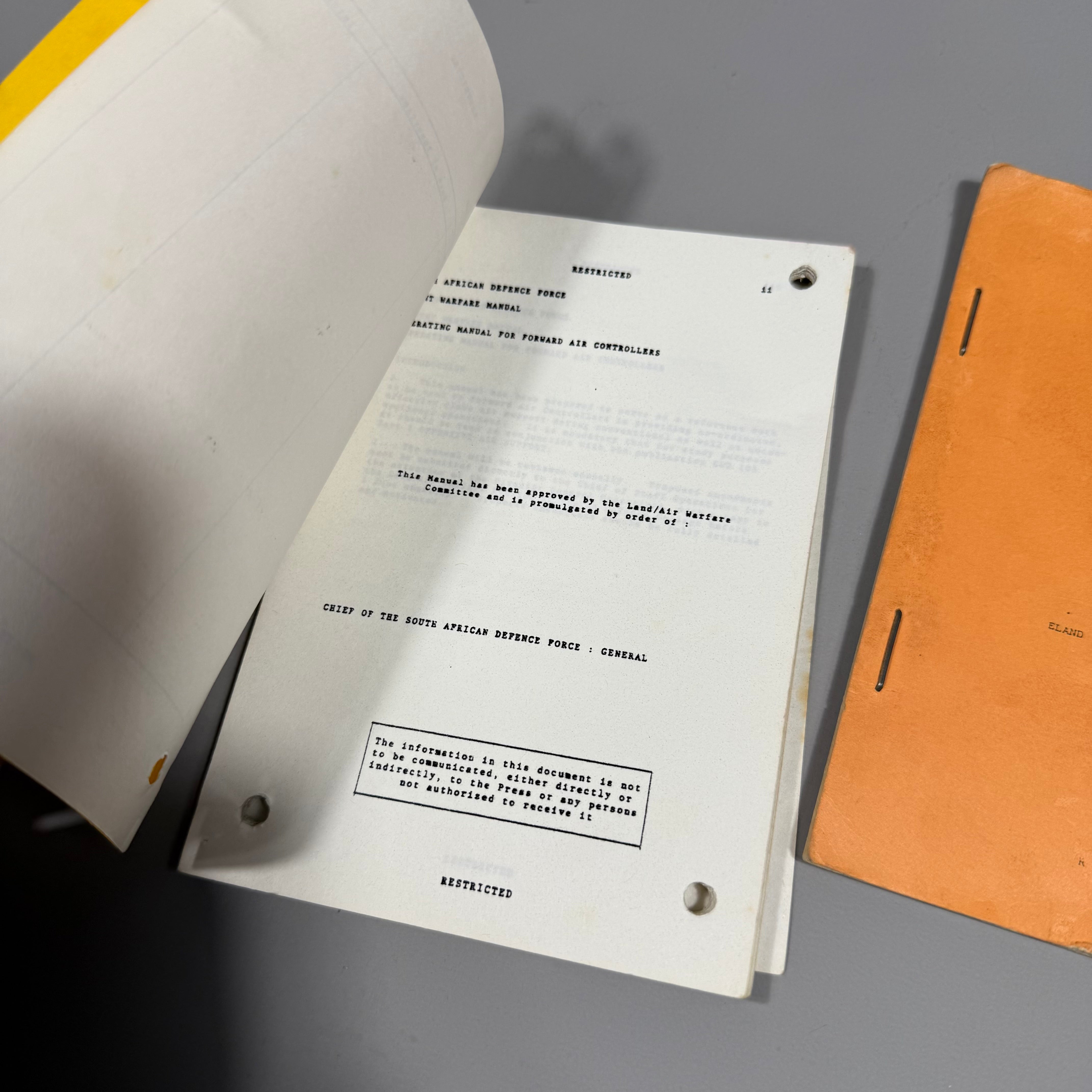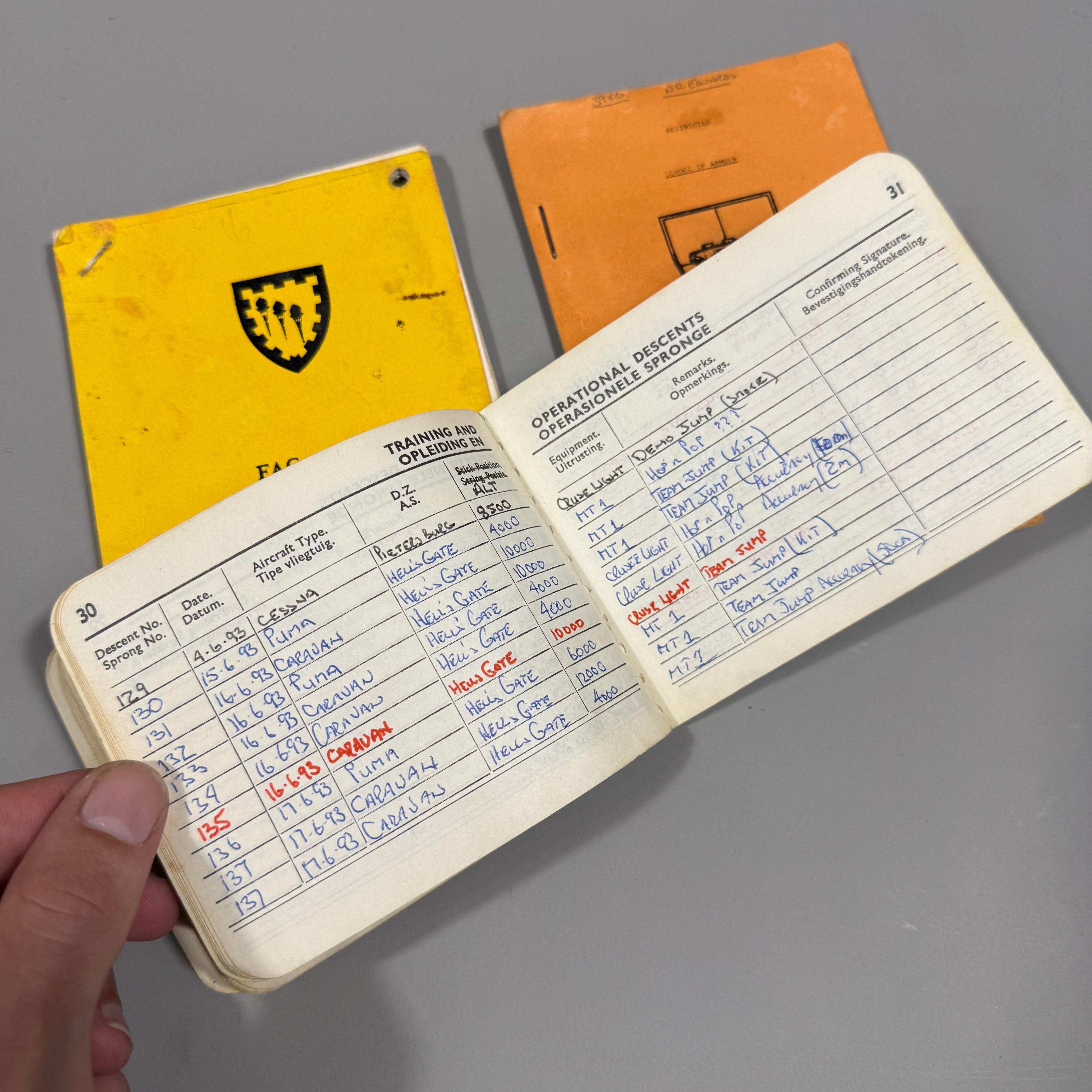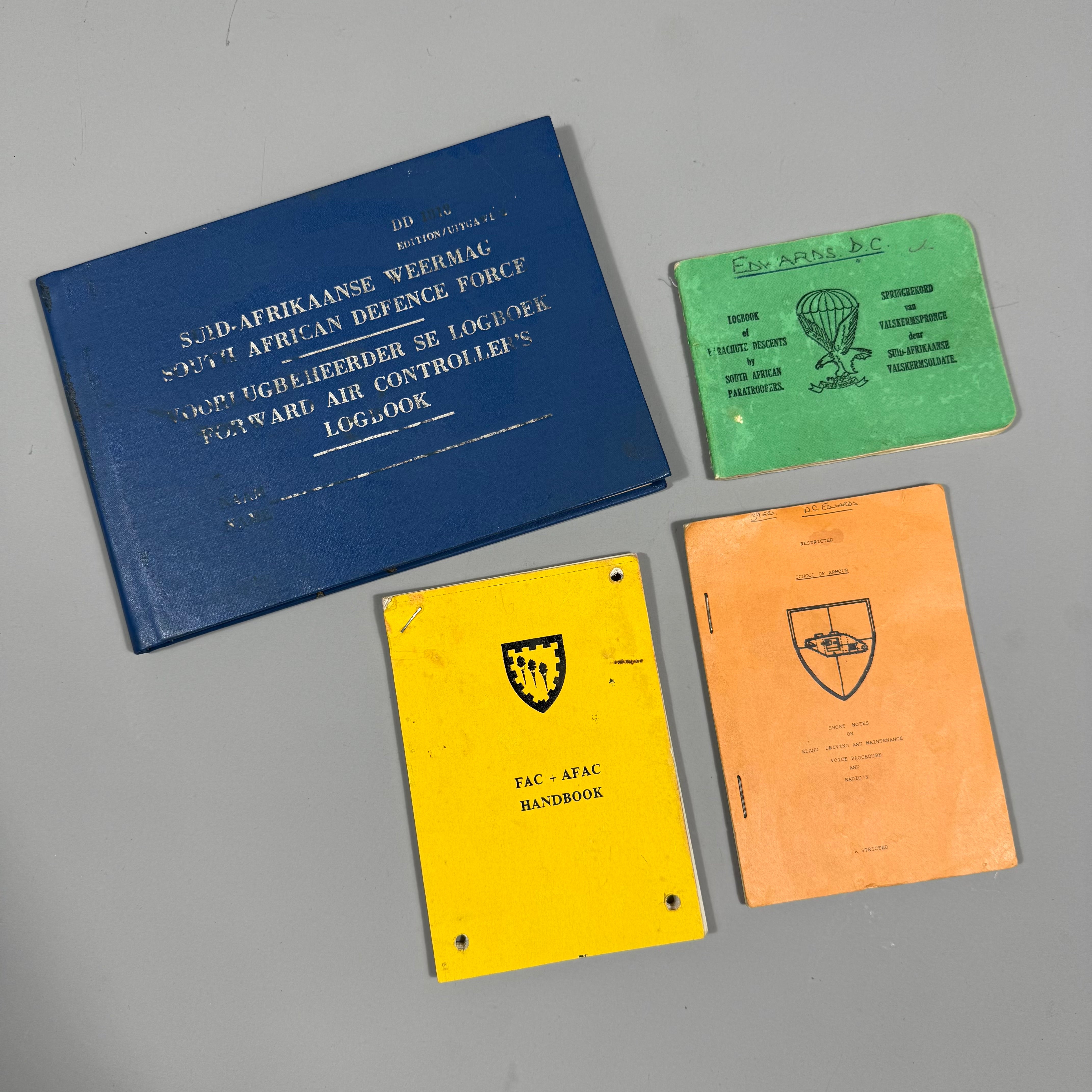 Original Border War South African Defence Force 5 RECCE Attributed LogBook Lot consisting of one Forward Air Controller Logbook, one SADF Parachute Descents Logbook, one FAC +AFAC Handbook, and one Restricted School of Armour Handbook.
