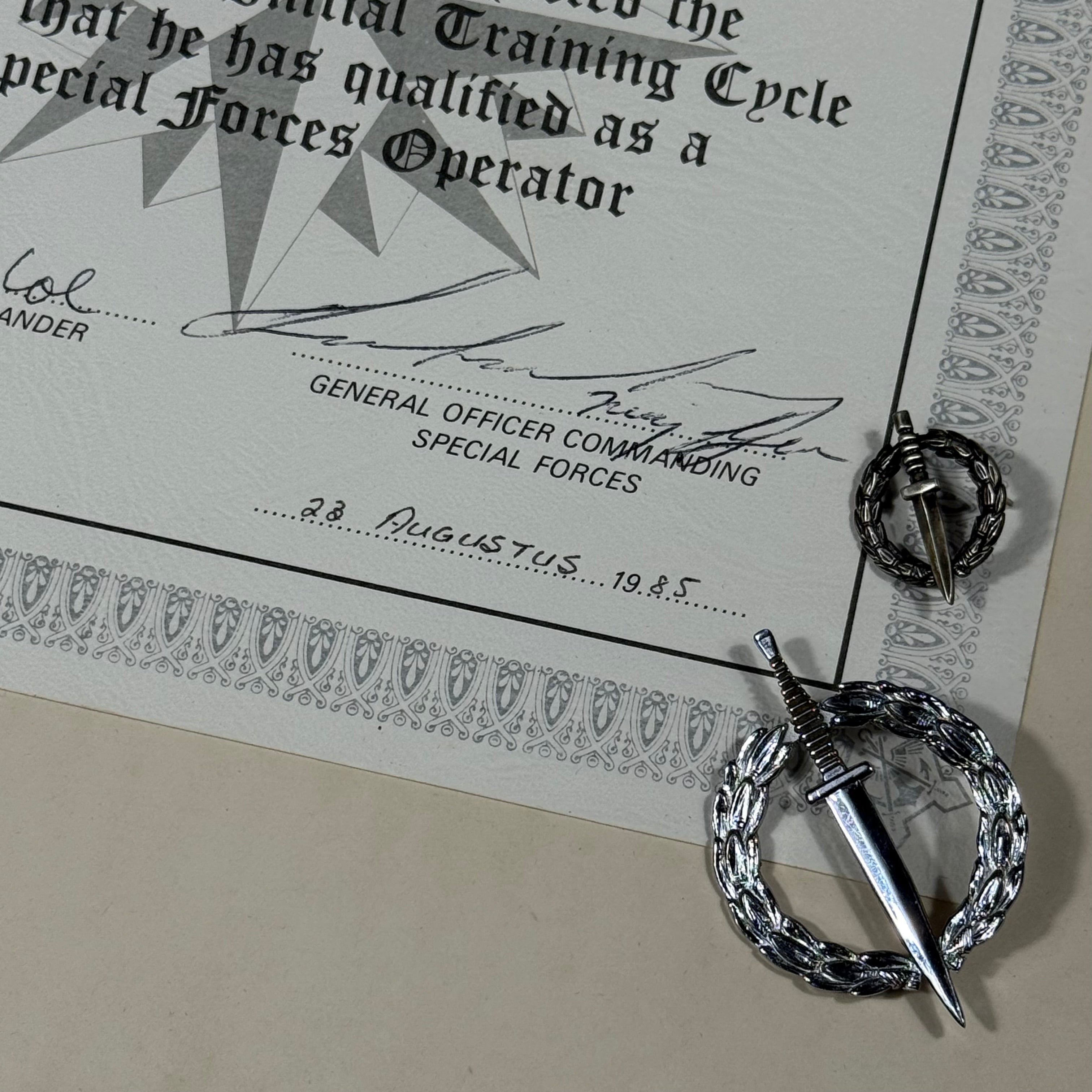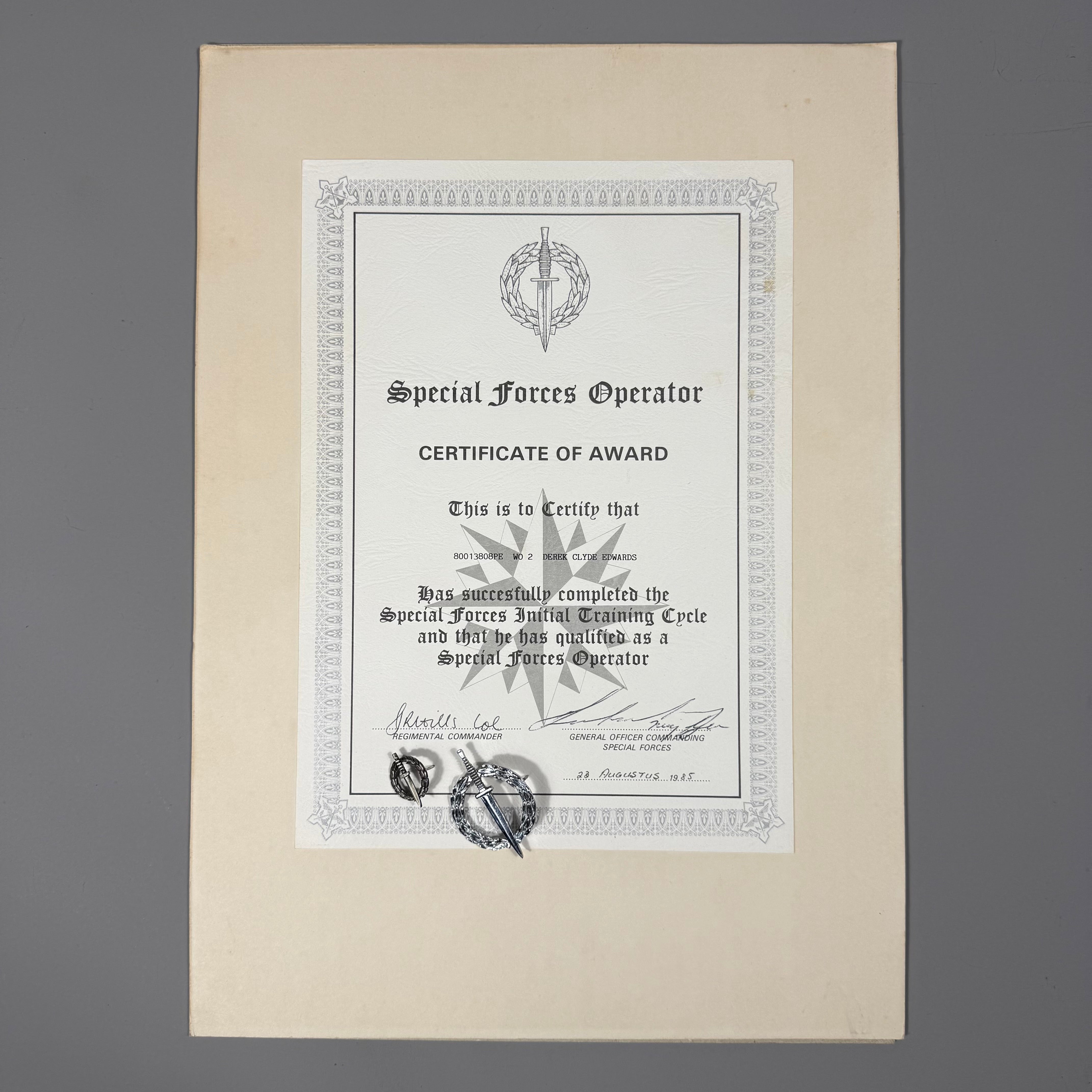 Original Border War 1985 Dated SADF 5 RECCE Attributed and Numbered Special Forces Operators Badge with Original Certificate and Matching Numbered Miniature Badge.