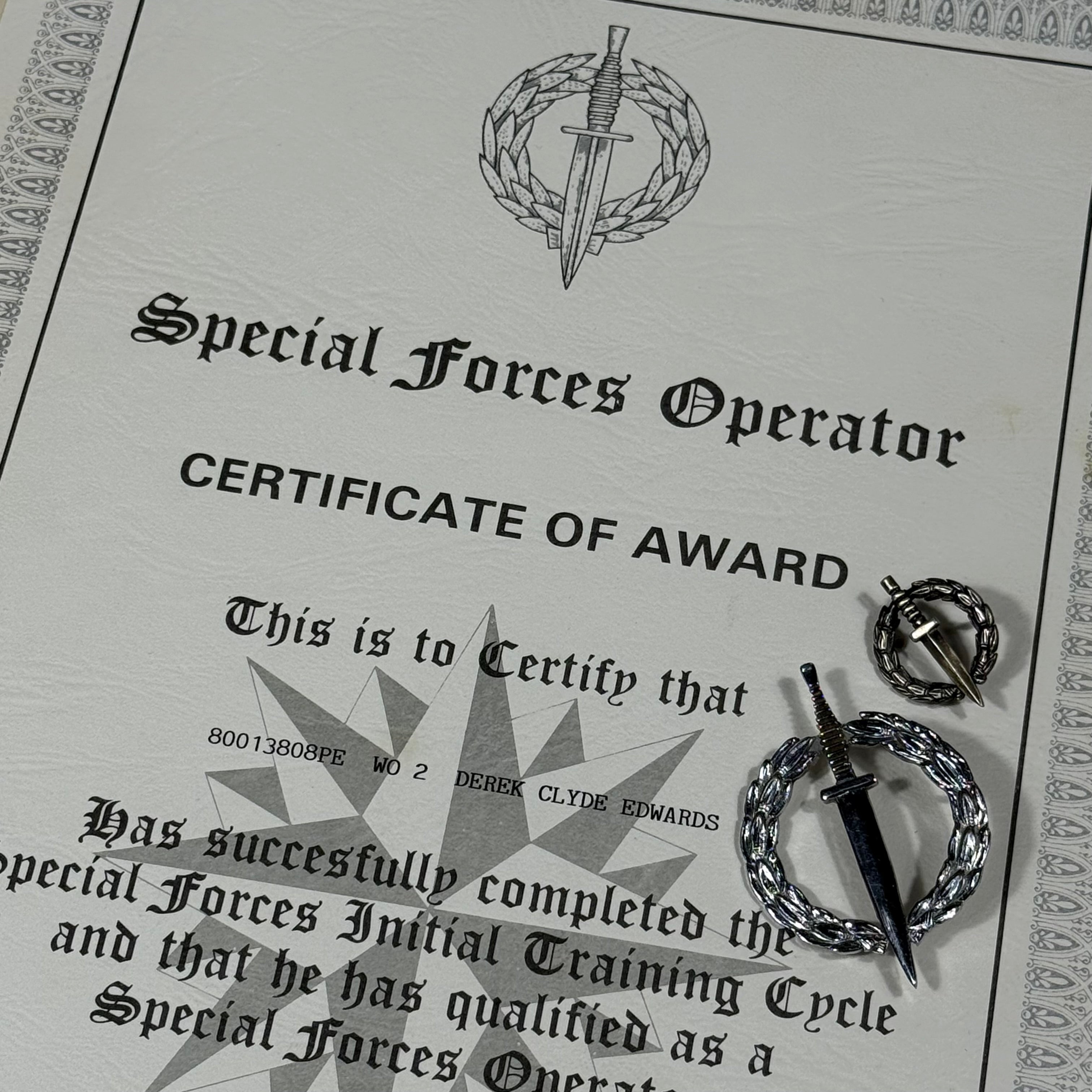 Derek “Eddy” Edwards’ initial service in the military started in Rhodesia, answering his nations call in 1966, upon enlisting, Edwards served with pride in the Rhodesian Light Infantry up until 1975, At the height of the Bush War, Edwards completed Selous Scouts Selection becoming a fully qualified Operator at the rank of C/SGT. Edwards served with the Scouts until the very end of the Bush War in 1980, after which he went to South Africa, as many Bush War veterans did, and completed Special Forces Selection earning the coveted Operator’s Badge in 1985 at the rank of WO2. Serving as an Officer with 5 Reconnaissance Regiment (RECCE), whose heritage comes from the Selous Scouts.