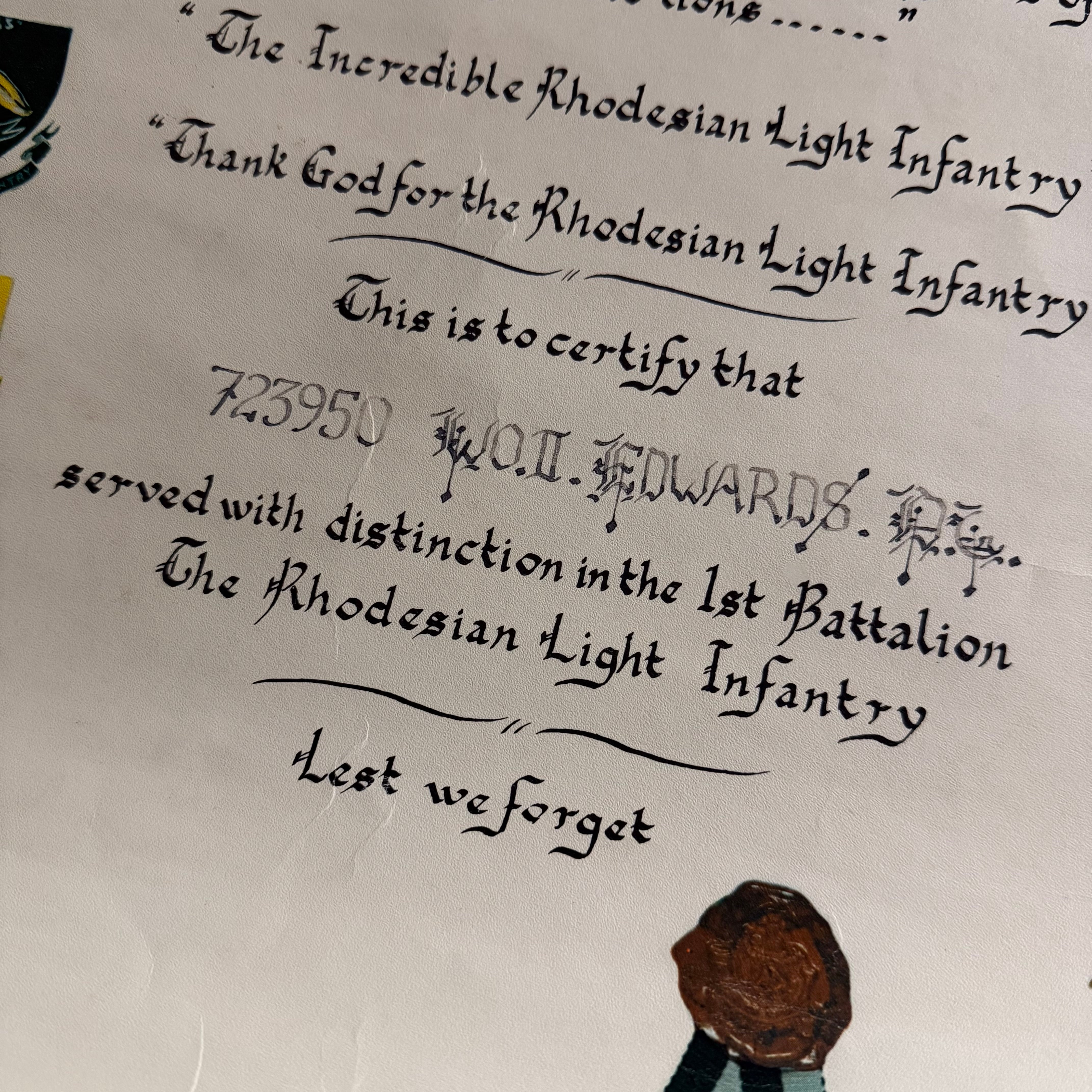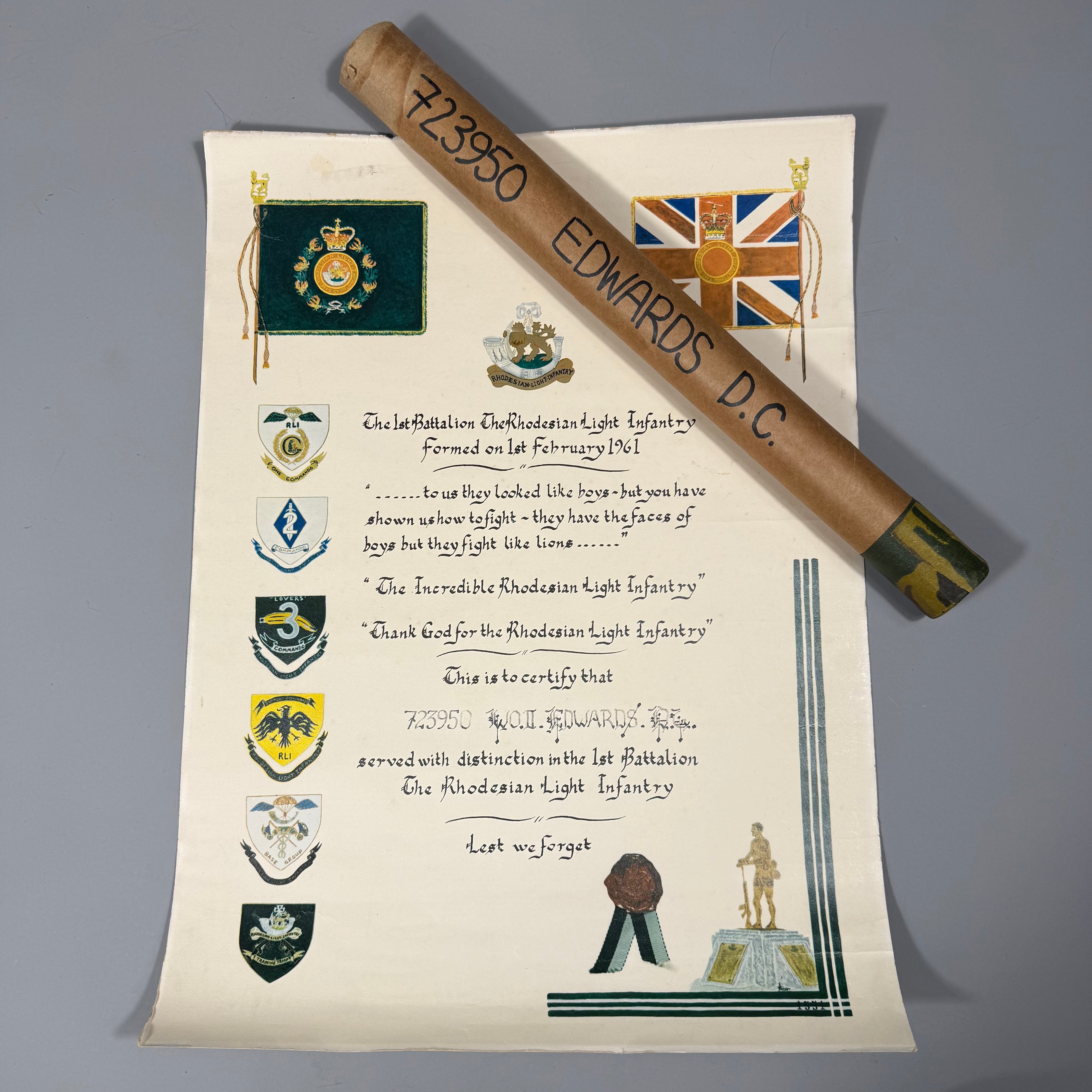 Original Bush War Rhodesian Light Infantry - Selous Scouts Attributed Certificate of Service with original issue tube.