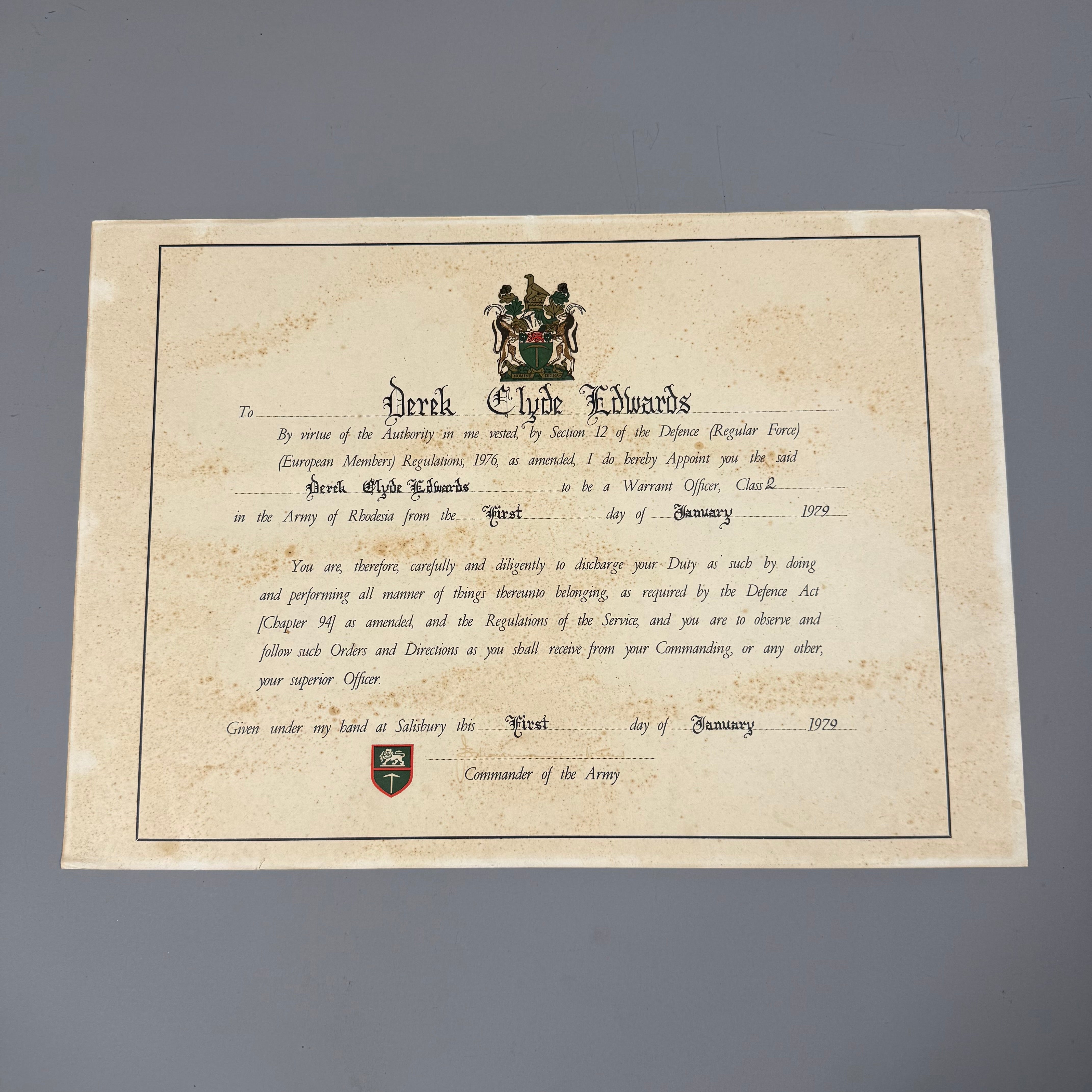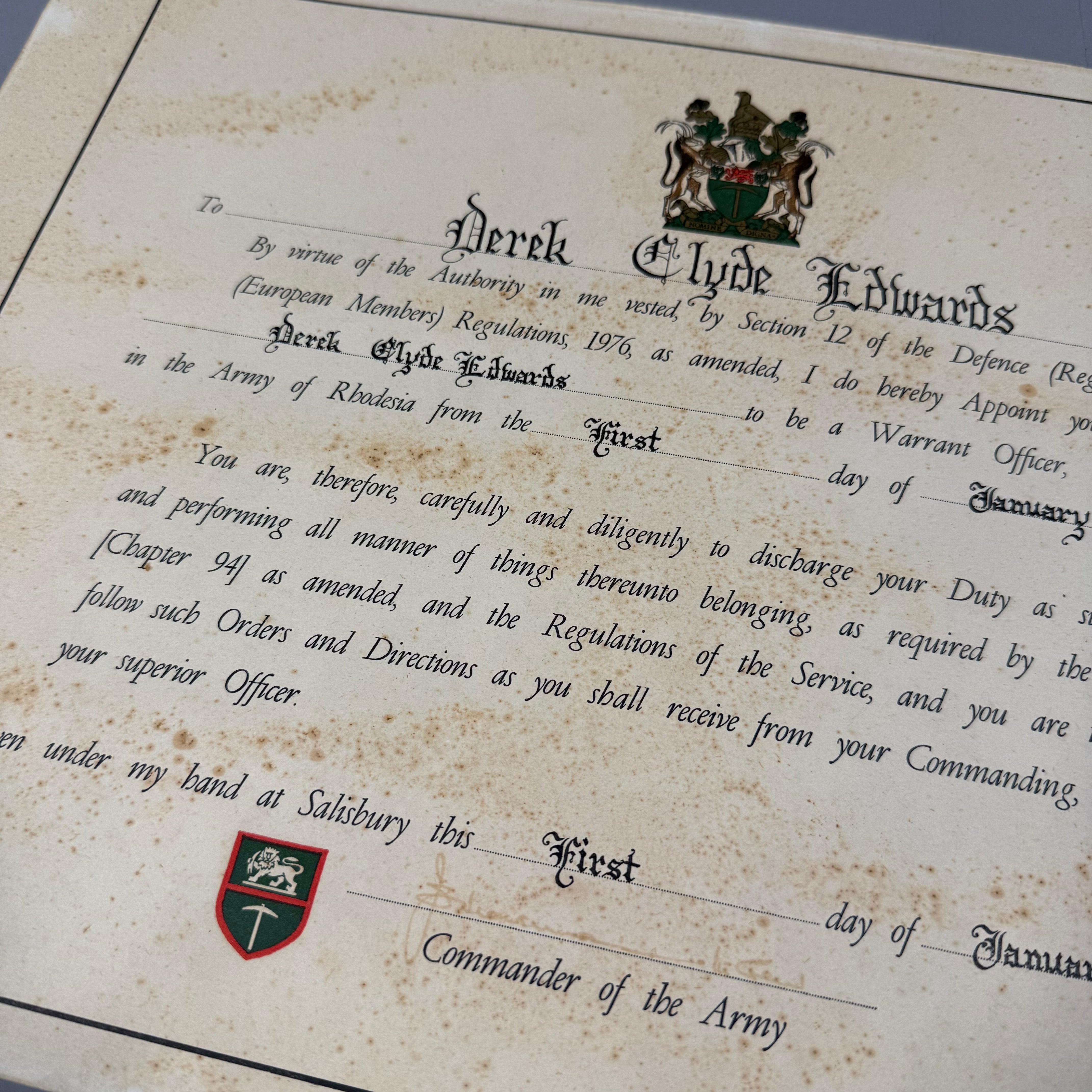 Original Bush War Rhodesian Selous Scouts Attributed Warrant Officer Promotion Certificate.