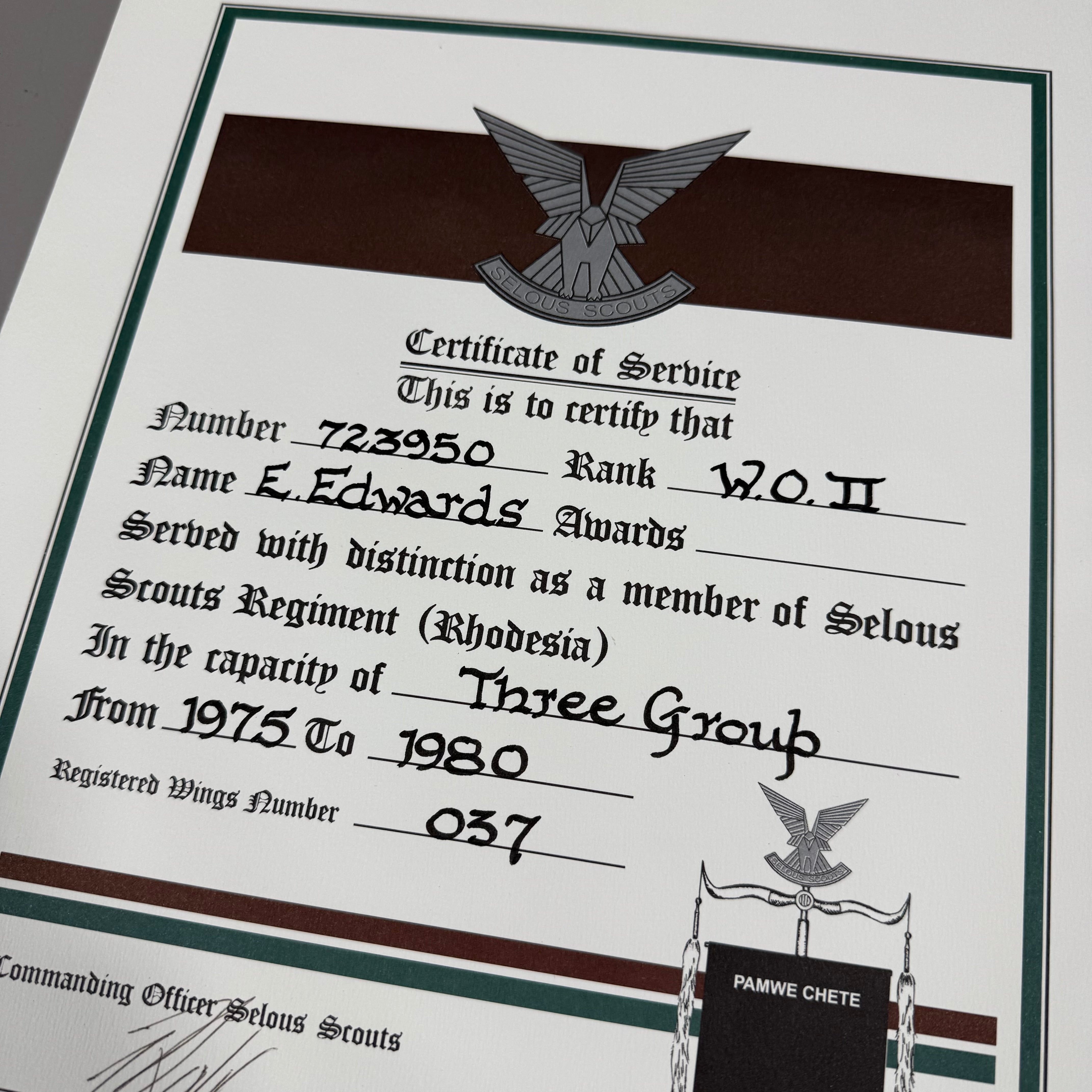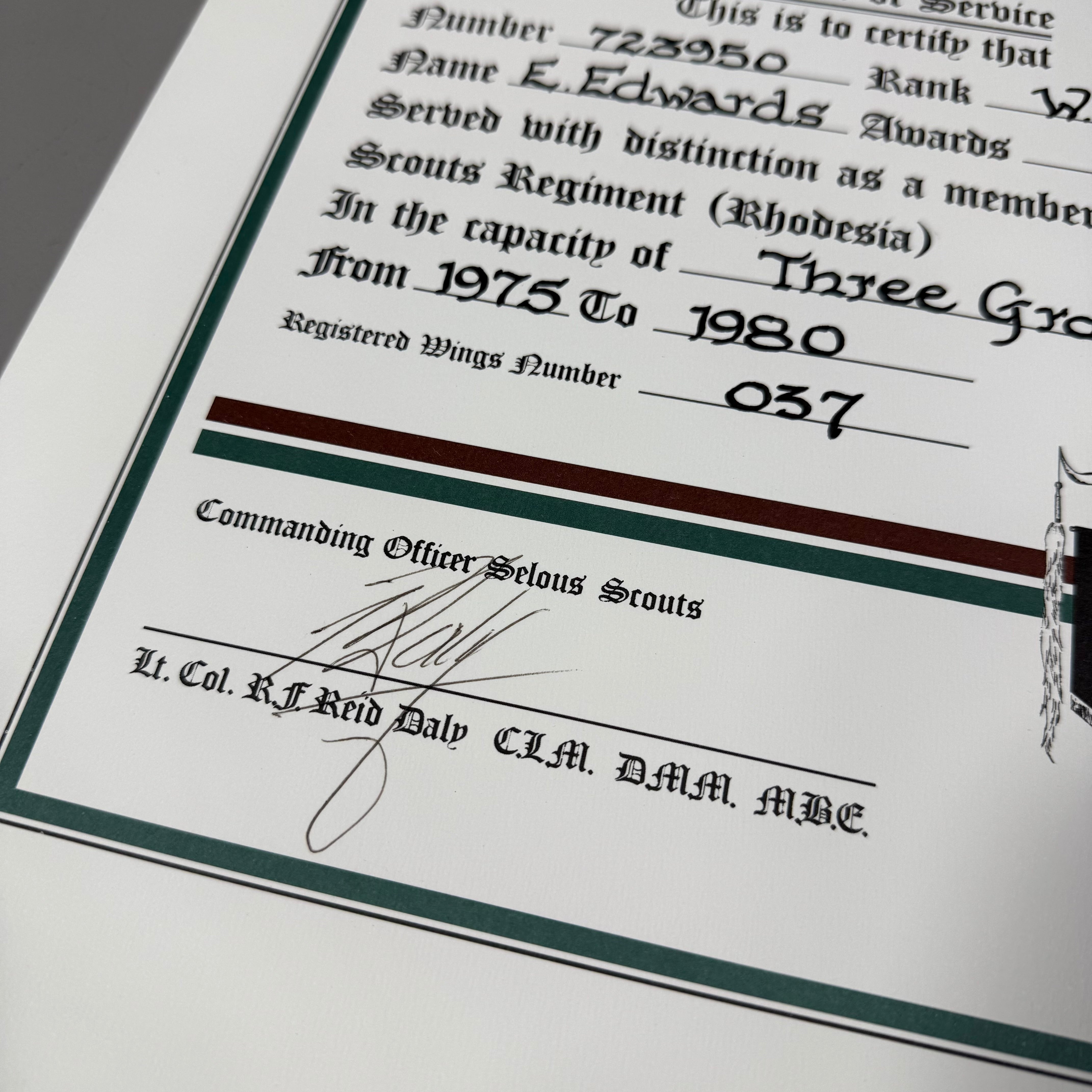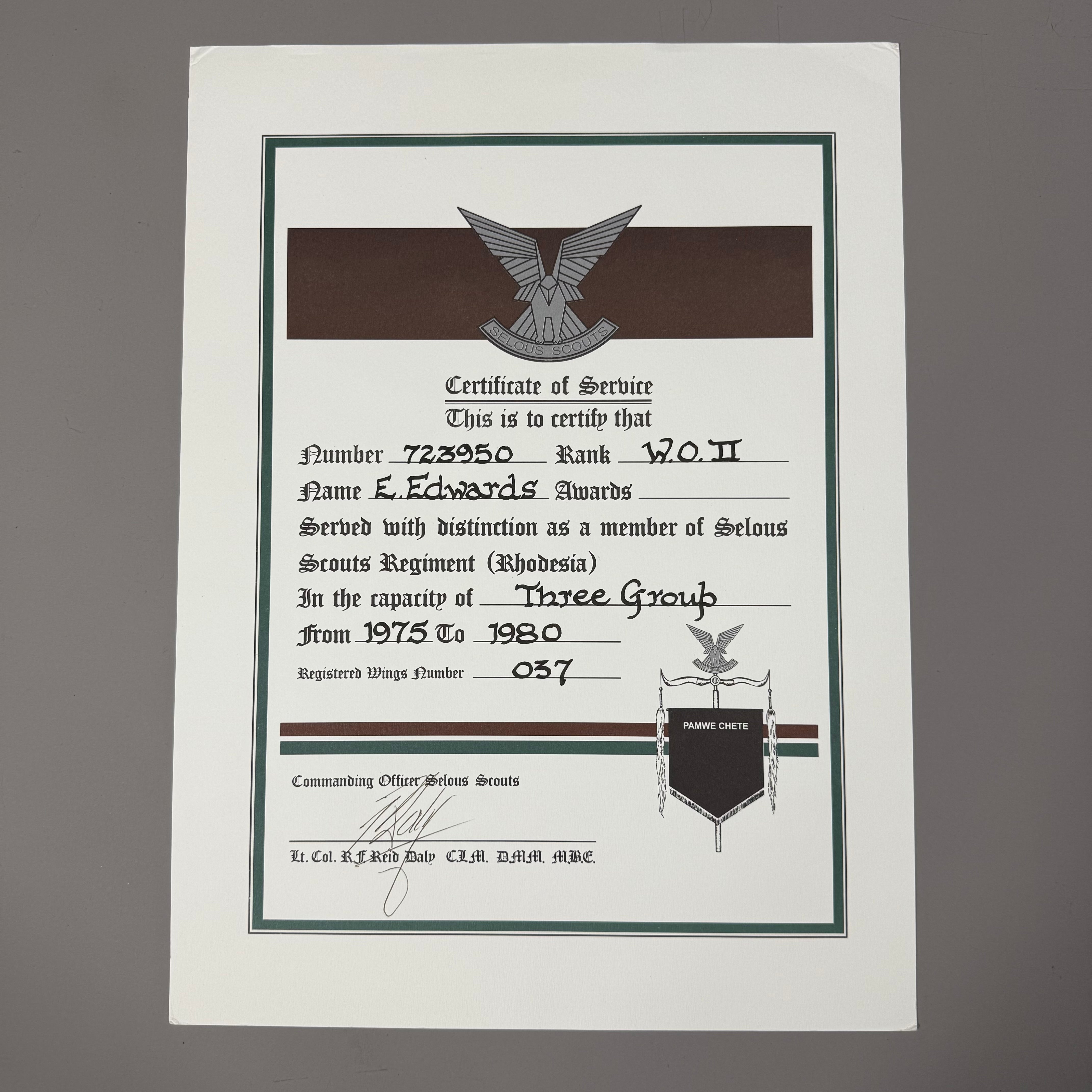 Original Bush War Rhodesian Selous Scouts Certifcate of Service Attributed to Sgt Derek “Eddy” Edwards and Signed by Ron Reid Daly.