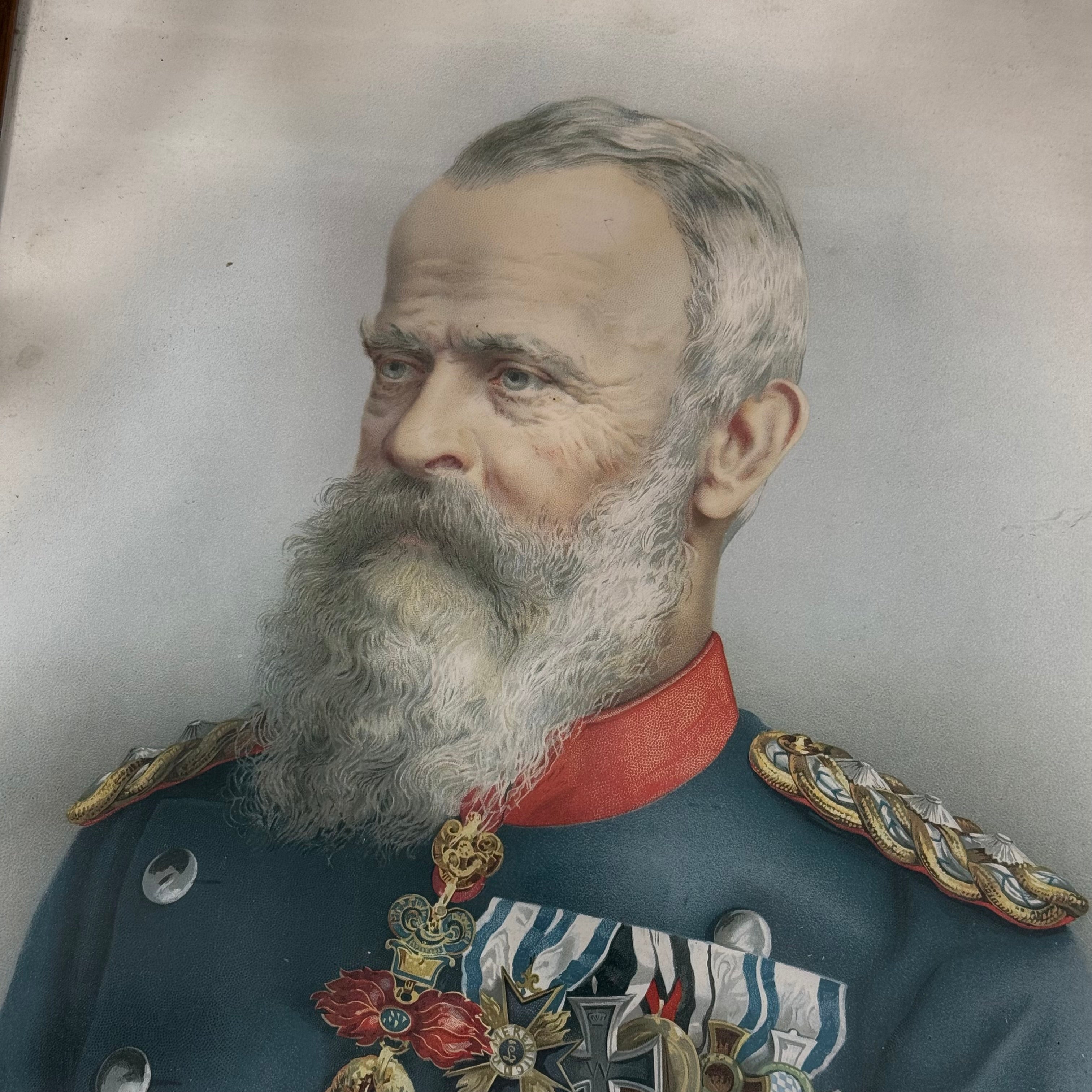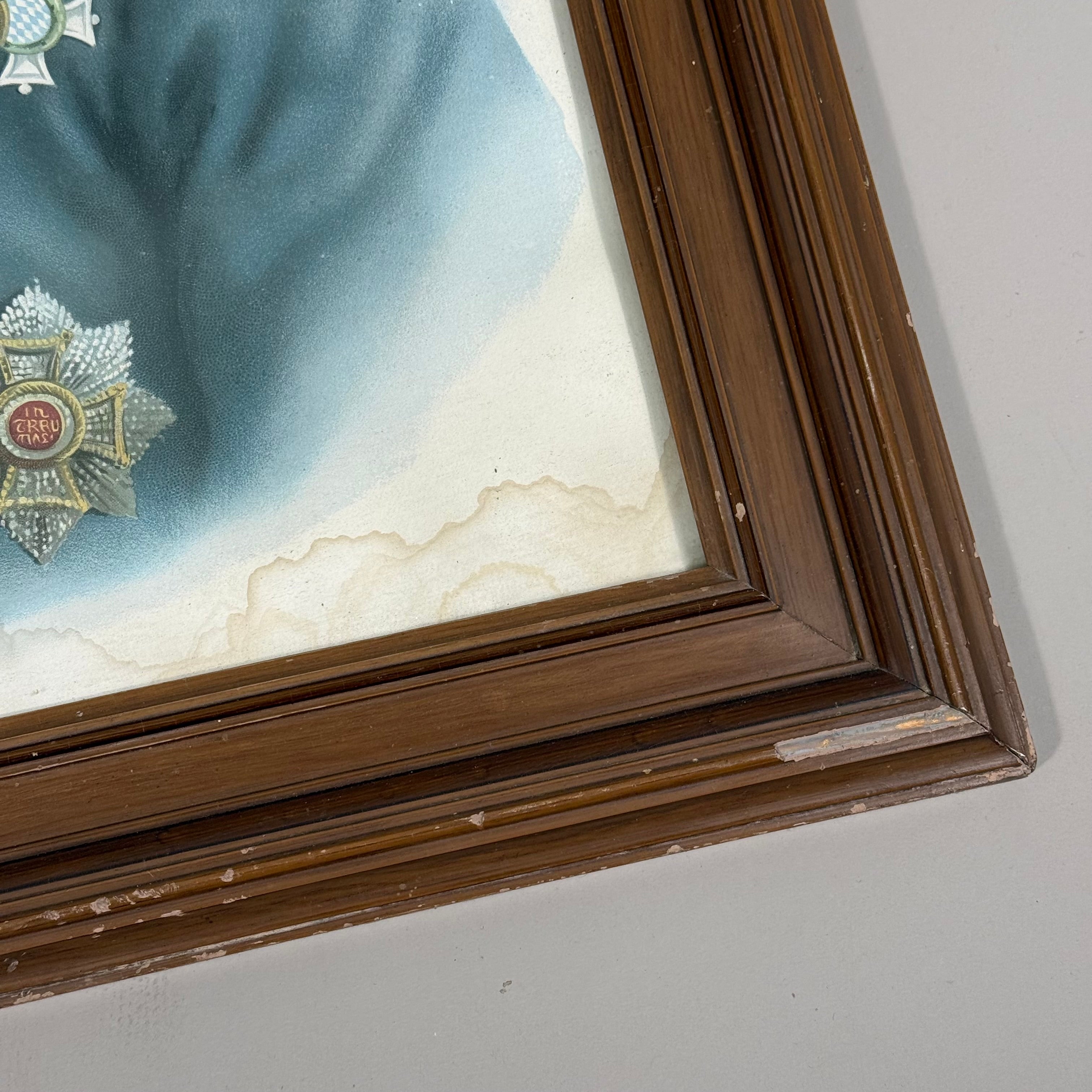 Original World War One or Prior period hand-colored lithograph with original frame depicting Luitpold Karl Joseph Wilhelm Ludwig, Prince Regent of Bavaria (12 March 1821 – 12 December 1912), who was the de facto ruler of Bavaria from 1886 to 1912, as regent for his nephews, King Ludwig II and King Otto. His regency arose due to his nephews' mental incapacity. Adorned in full dress uniform with a highly detailed array of orders and decorations. The officer's stern countenance, formidable beard, and aged features suggests a veteran from the Franco-Prussian War or early German Empire period. He is shown wearing multiple medal bars, including what appears to be the Iron Cross and various starburst orders. His double-breasted, dark tunic features six buttons in the front, fringed shoulder epaulets with gold detail, and a distinctive red collar - the mark of general officer rank in the Imperial German Army. Prominently, he wears the Grand Cross Breast Star of the Order of the Red Eagle with swords, among others. The lithograph is professionally framed in a period wood frame with glass and retains its original paper backing, now aged and brittle. Light water staining is visible at the bottom edge of the print - common in antique items of this age - and does not affect the central image. The back remains sealed, indicating the lithograph has not been removed or altered post-framing, adding to its historical integrity. The lithograph has preserved its vivid coloration through the years. There is evident water staining at the lower margin, along with some age-related discoloration and waviness. The wood frame shows modest wear and patina consistent with age, with no visible breaks or separations. Glass is intact. Portraits such as this were commonly displayed in military offices, family parlors, and regimental associations. The detailing of the uniform and orders suggests a high degree of accuracy in replicating the military regalia of the late 19th century, with a particular nod to Prussian tradition and honor culture.
