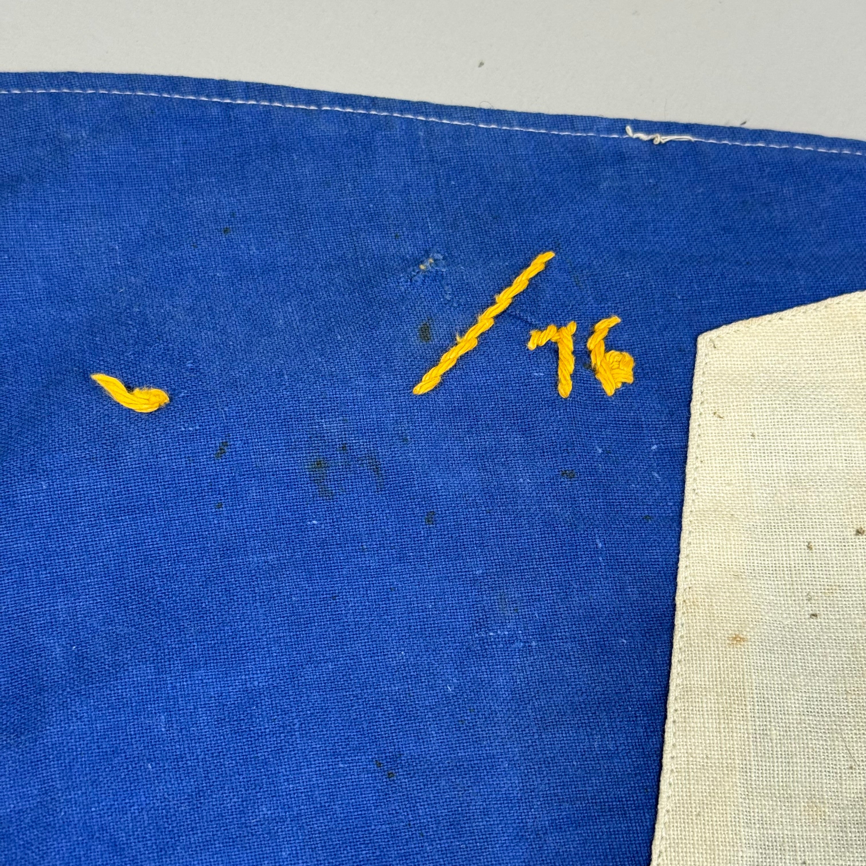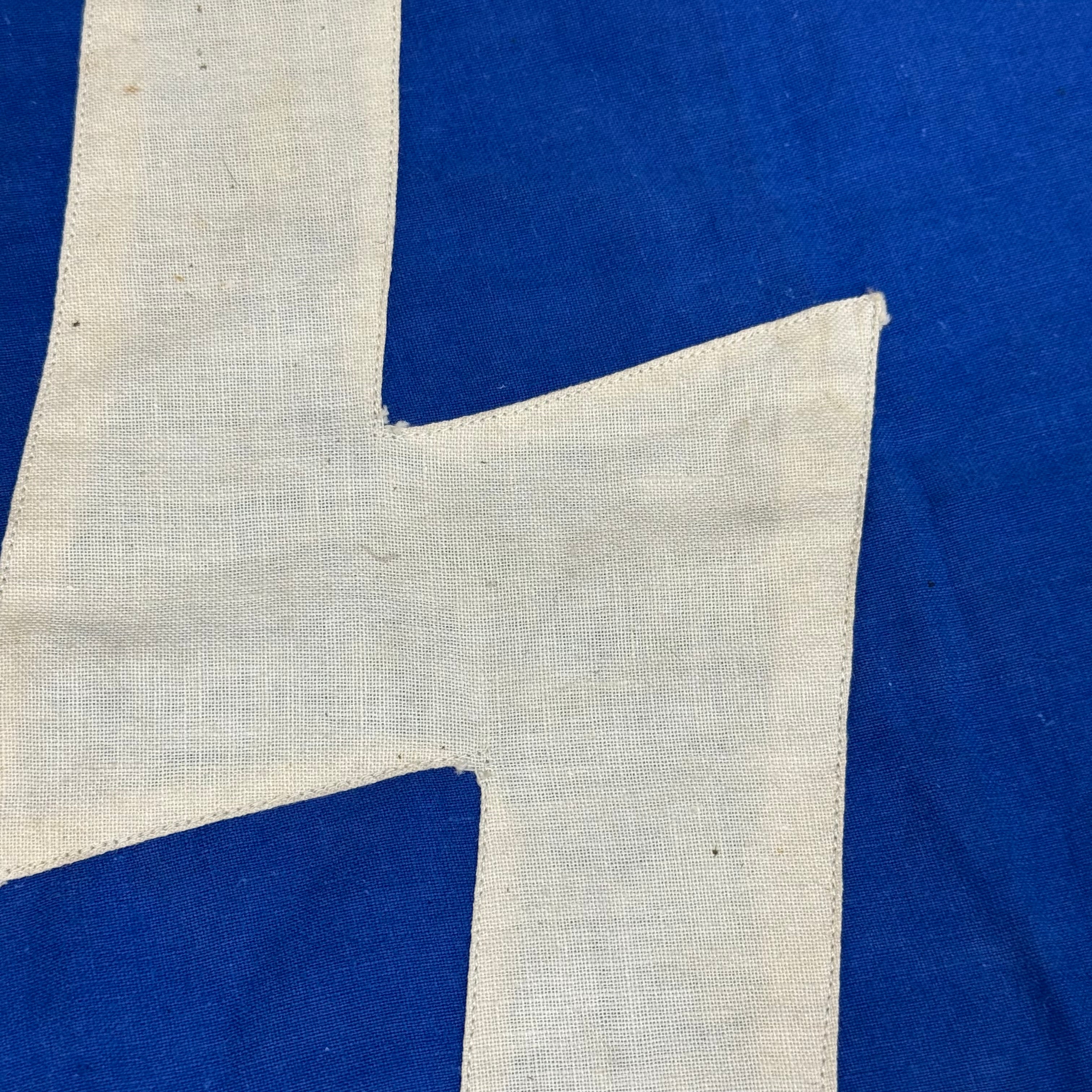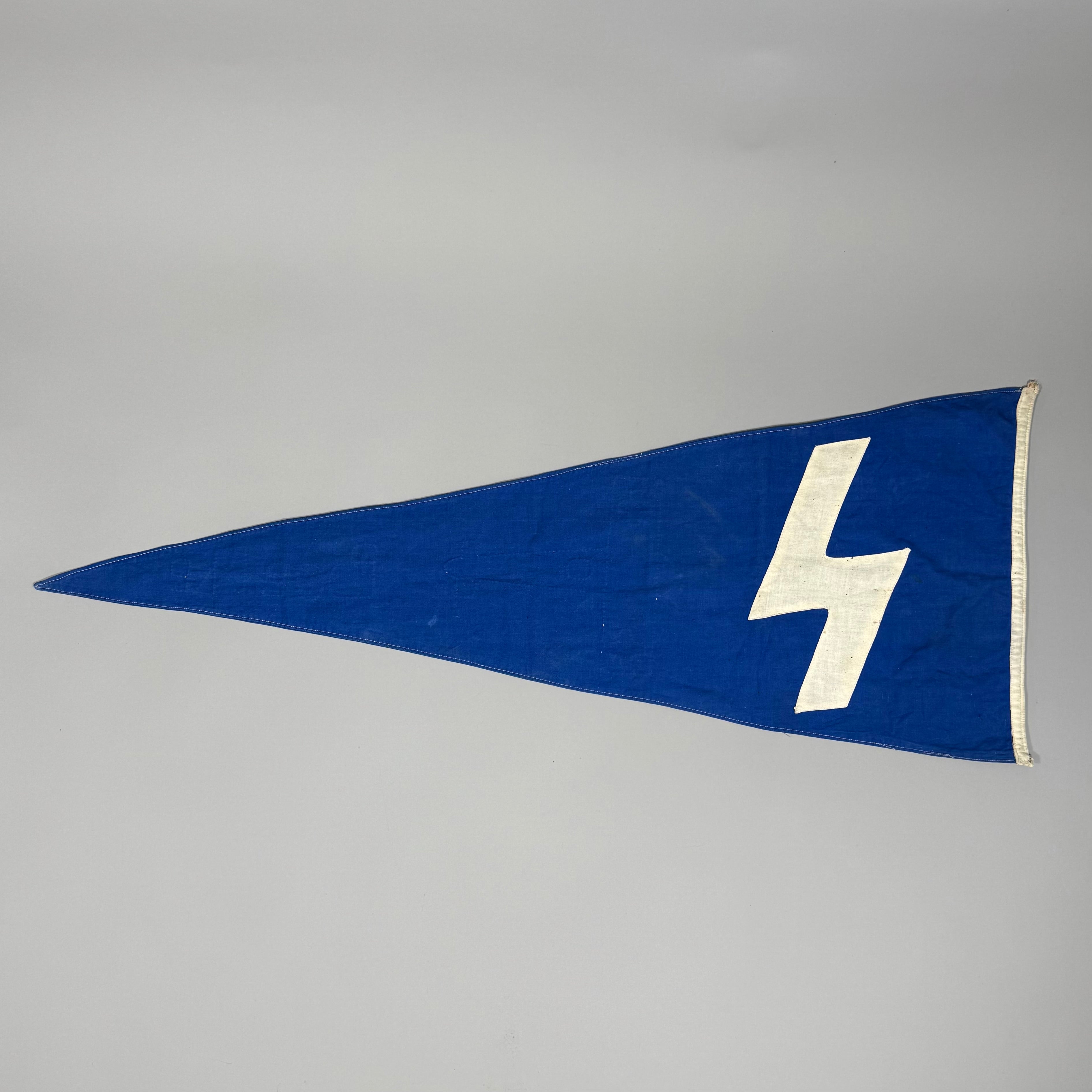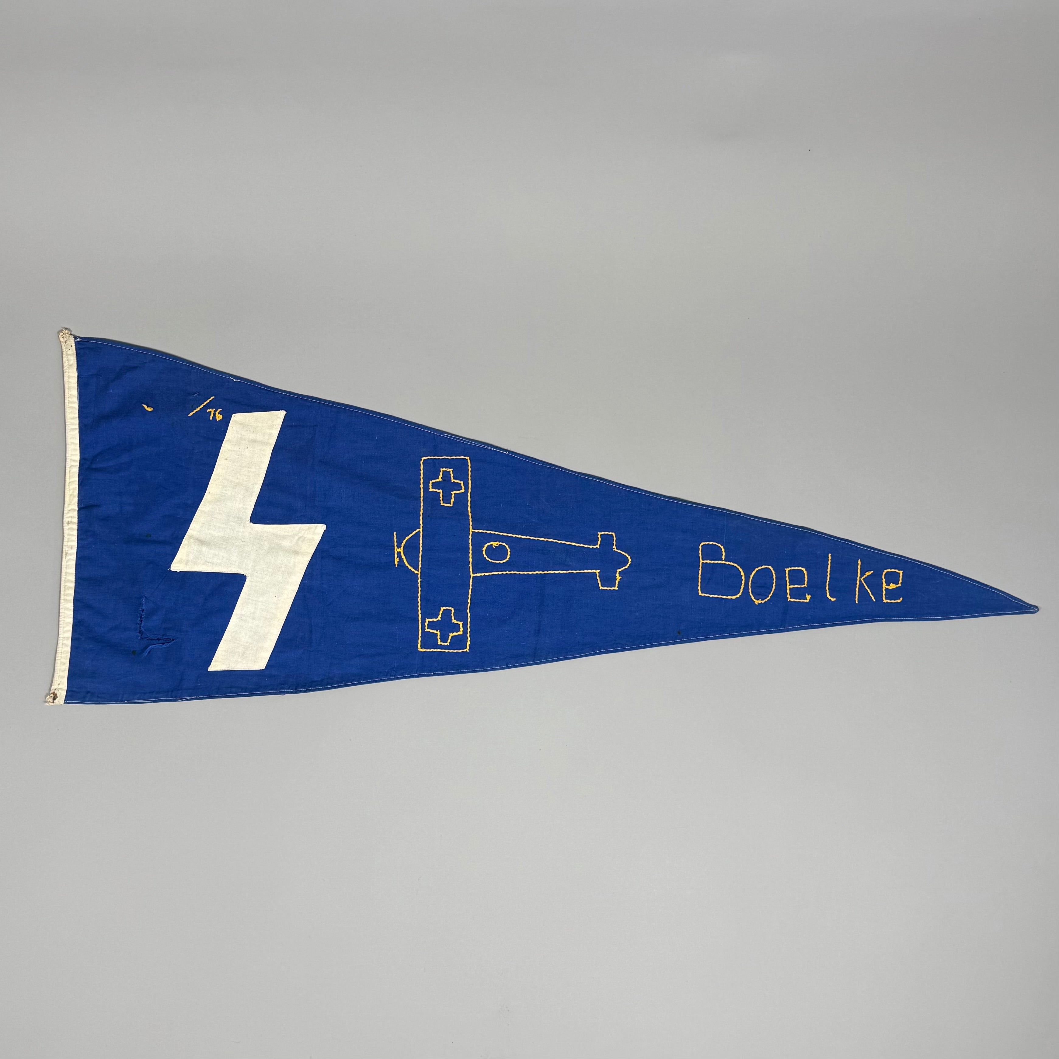 Amazing, one of a kind pre-RZM home made DJ “Wimpel” (Pennant) feauturing hand stitched motif’s such as “Boelke” and a Bi-Plane on one side along with remnants of stitching for a Bann number. The pennant itself is multi-piece construction, consisting of double-overlaid blue and white cotton twill, both sides overlaid by a white Sig rune affixed with machine stitching. One slight tear to the obverse as shown.