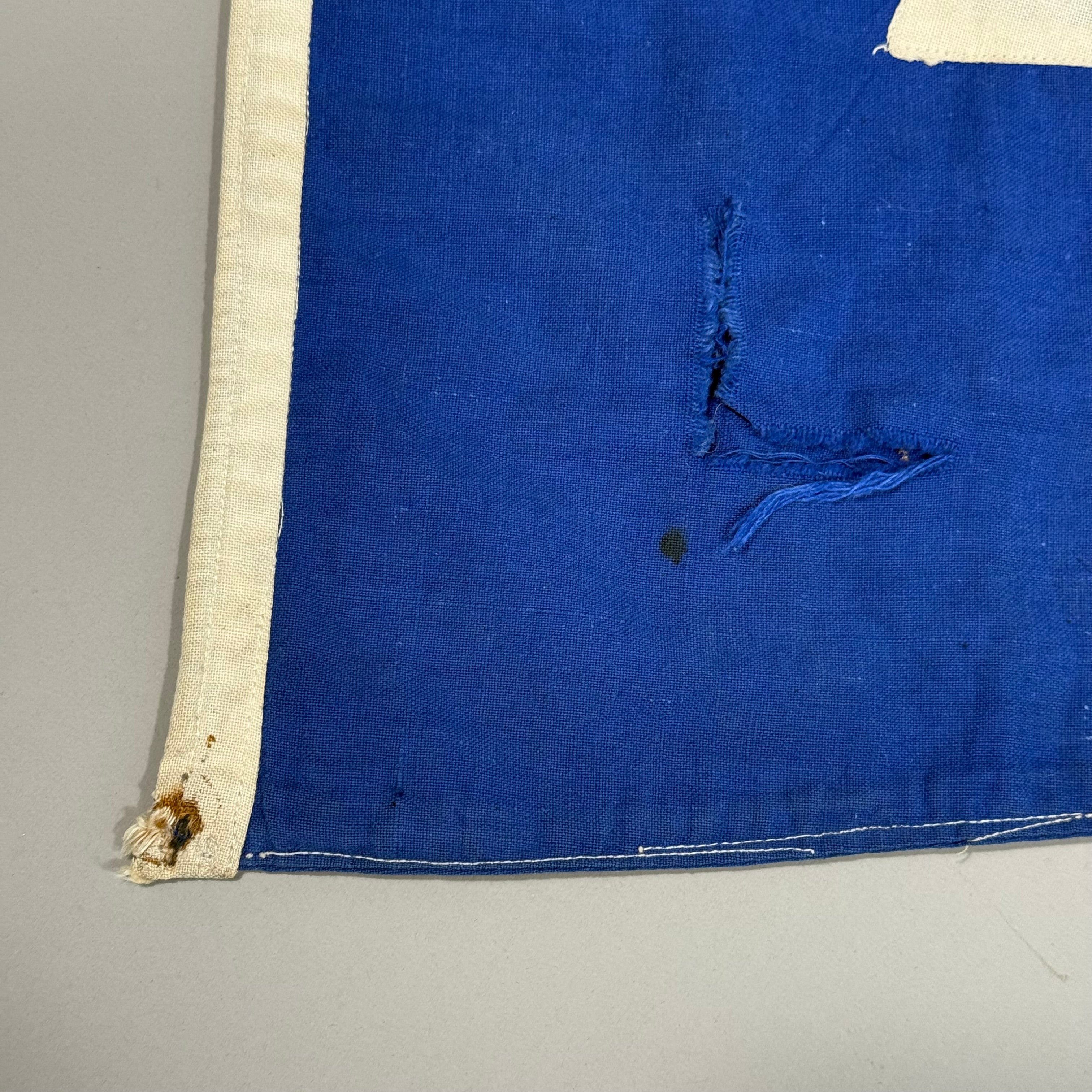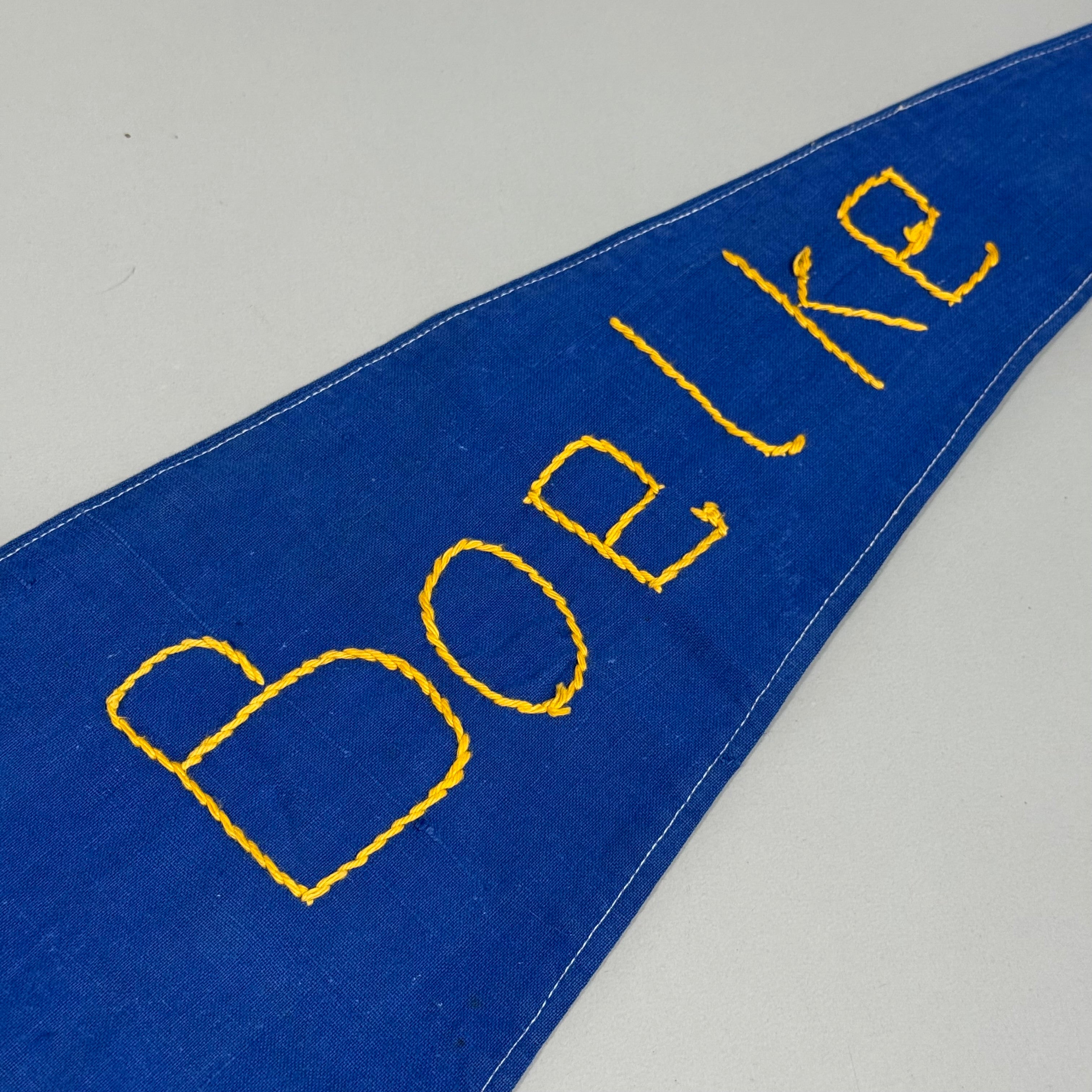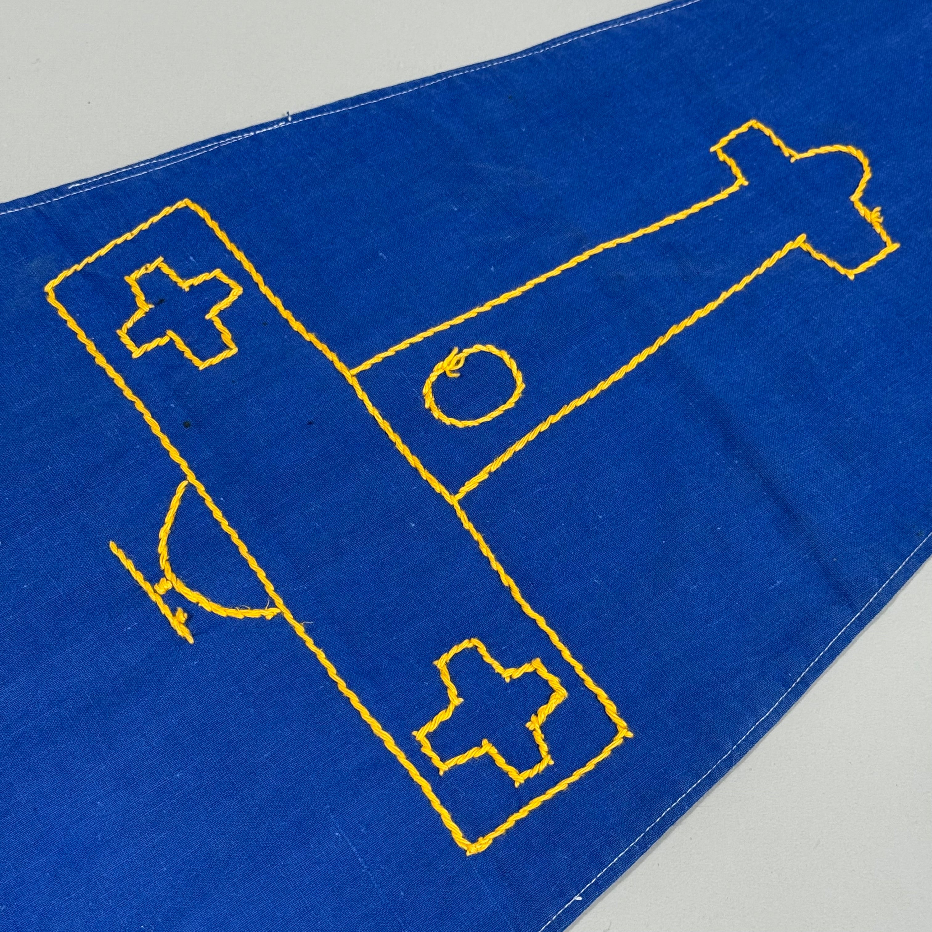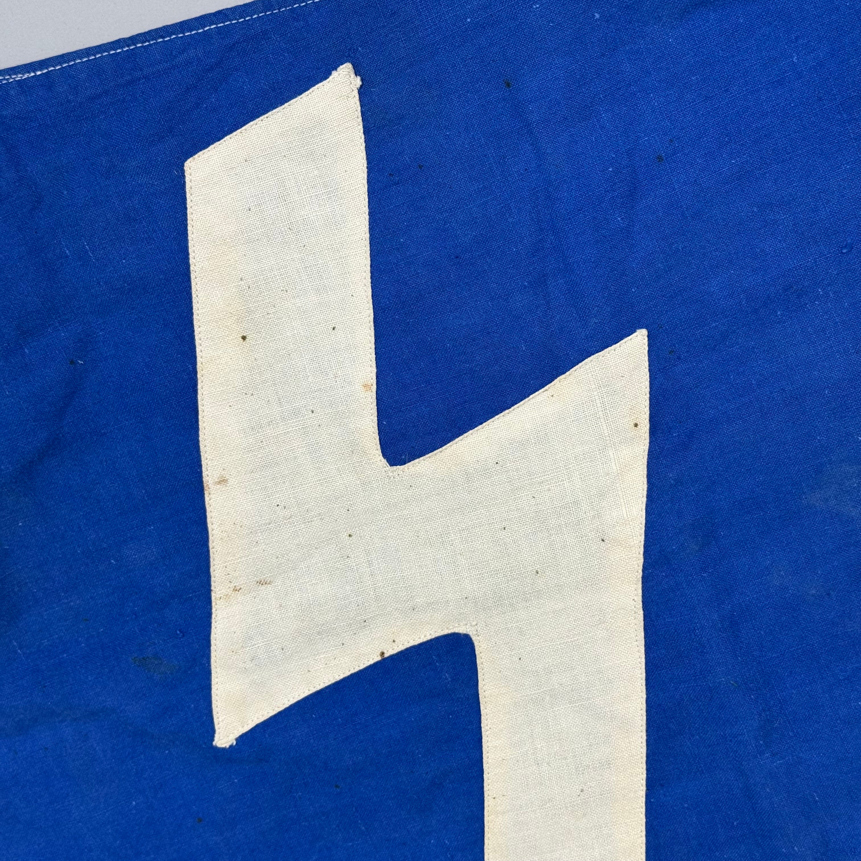 Amazing, one of a kind pre-RZM home made DJ “Wimpel” (Pennant) feauturing hand stitched motif’s such as “Boelke” and a Bi-Plane on one side along with remnants of stitching for a Bann number. The pennant itself is multi-piece construction, consisting of double-overlaid blue and white cotton twill, both sides overlaid by a white Sig rune affixed with machine stitching. One slight tear to the obverse as shown.