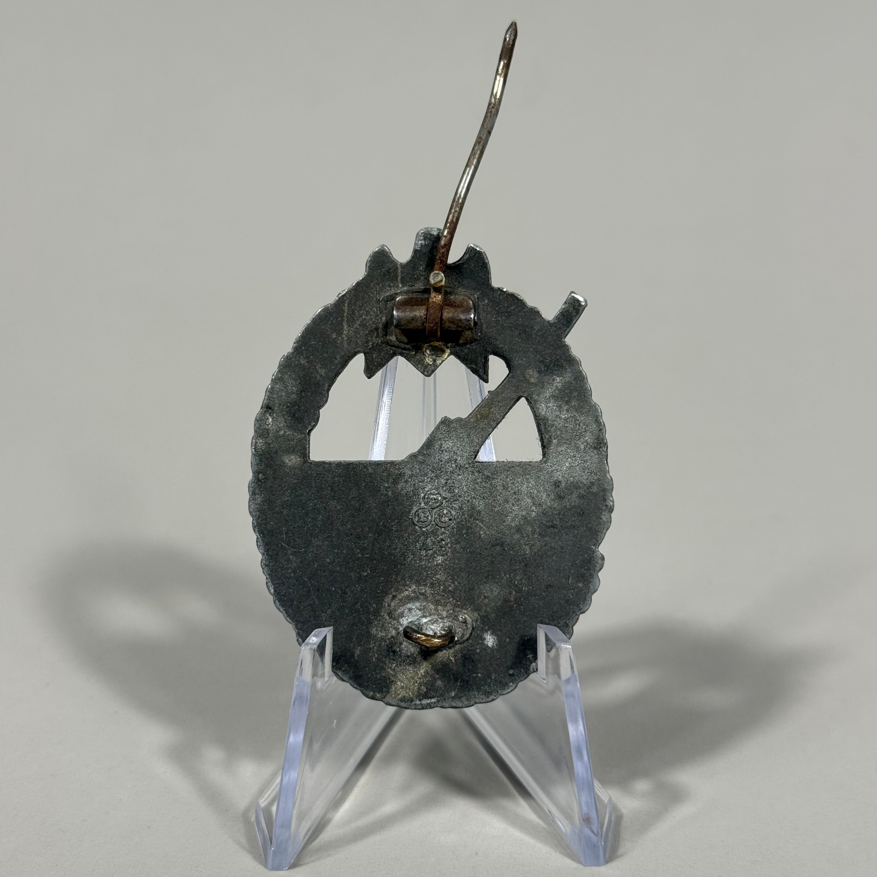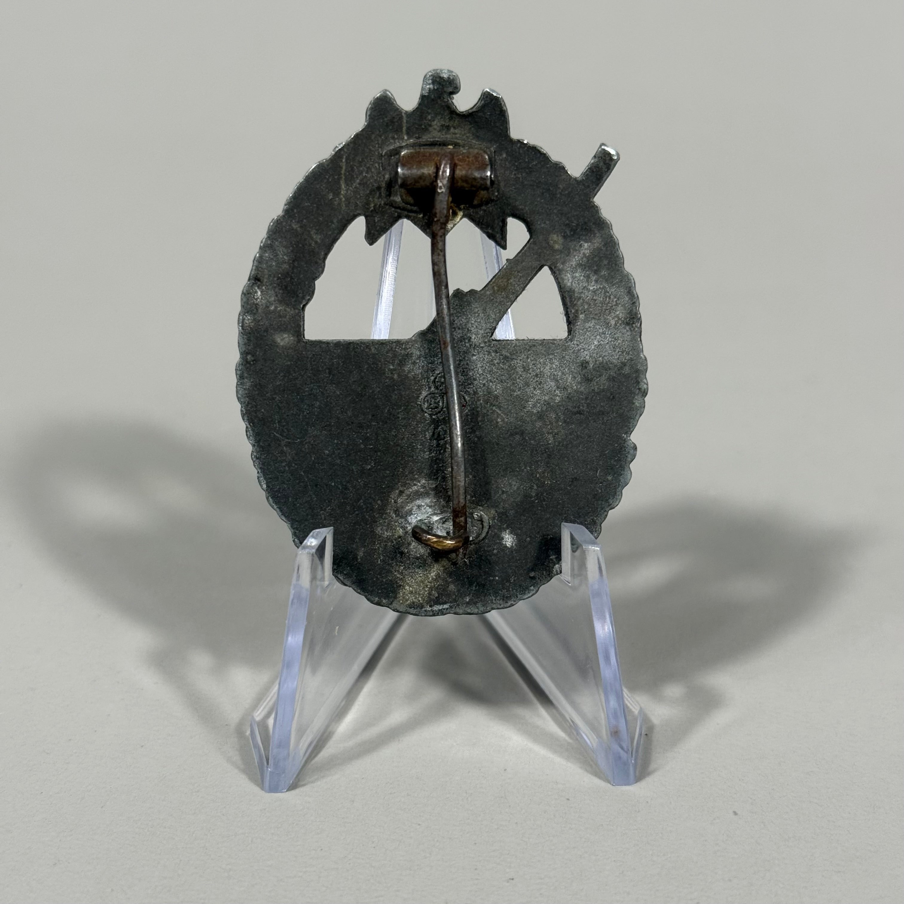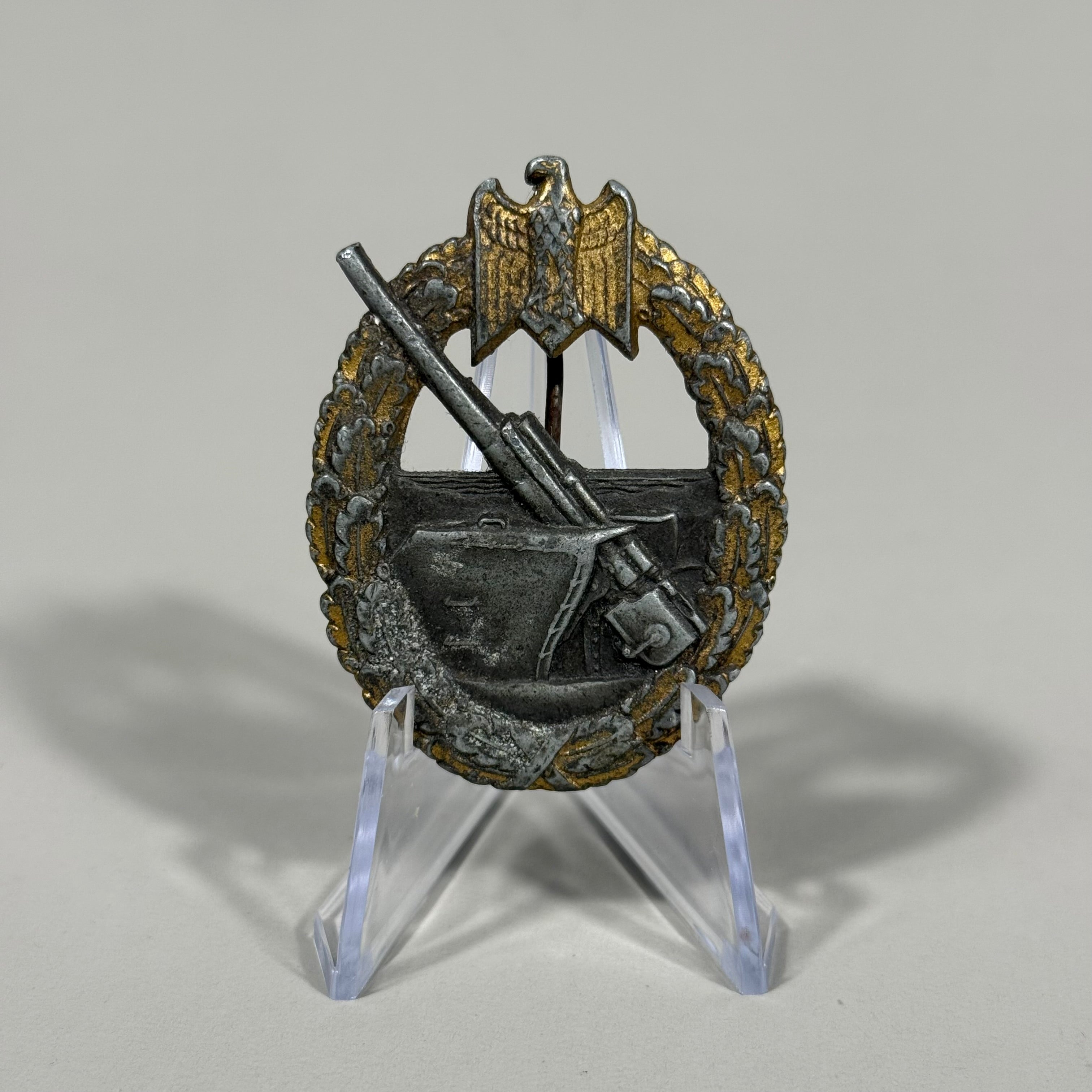 The Coastal Artillery War Badge was introduced on June 24th 1941 by Oberbefehlshaber der Kriegsmarine und Großadmiral, (Commander in Chief of the Navy and Grand Admiral), Erich Raeder for award to land based Naval coastal artillery and anti-aircraft personnel in recognition of their achievements. The award was bestowed based on a point system with the main criteria being "merit in action". Die struck, zinc alloy construction badge is in the form of a gilt washed, vertically oval, oak-leaf wreath with a national eagle with down-swept wings, clutching a canted swastika in it’s talons, superimposed to the top center, encompassing the frosty silver washed, cut-out likeness of an 88mm coastal artillery gun with the barrel of the gun extending beyond the edge of the wreath. Complete with original hinge, pin and catch assembly, and maker marked with the logo of Friedrich Linden, Lüdenscheid.