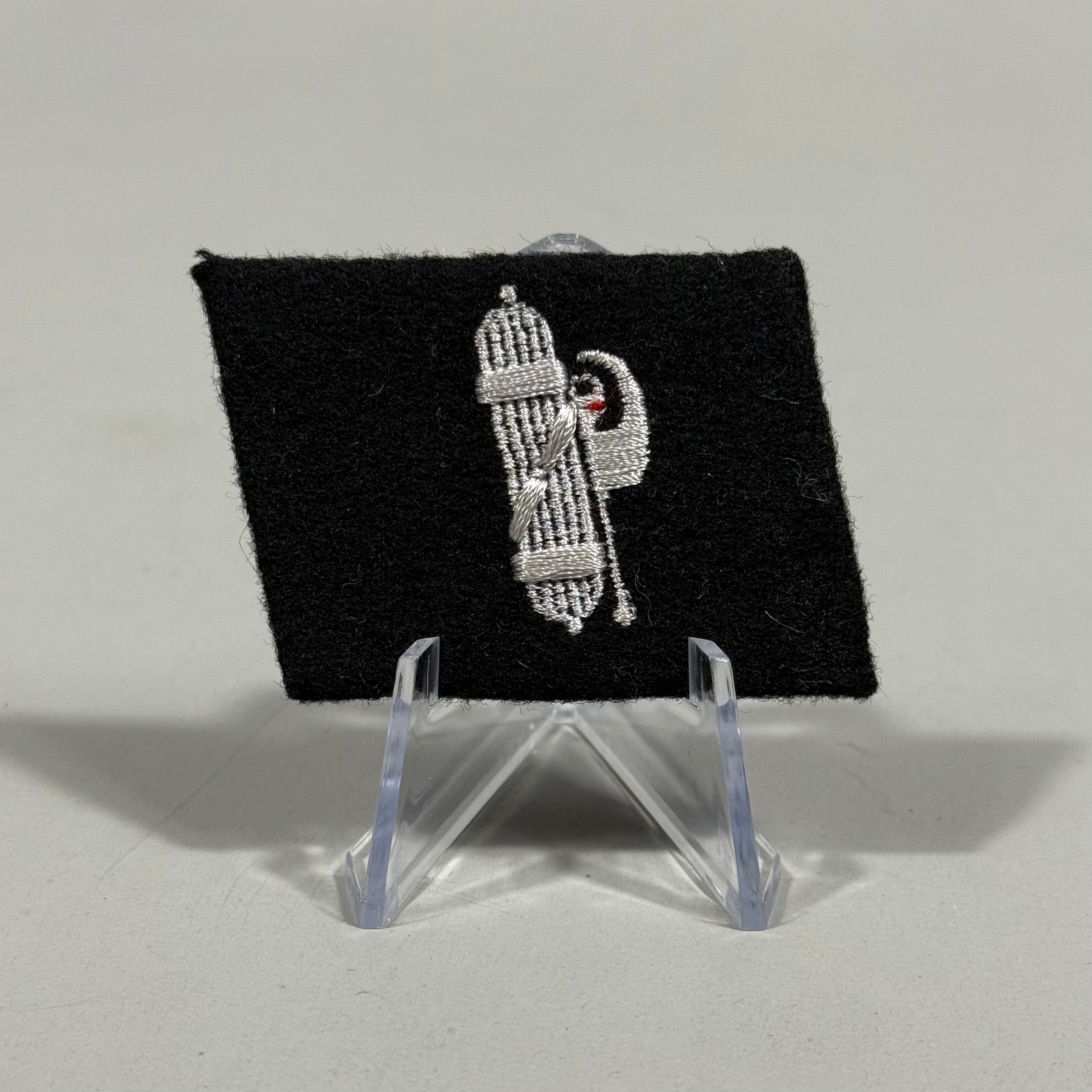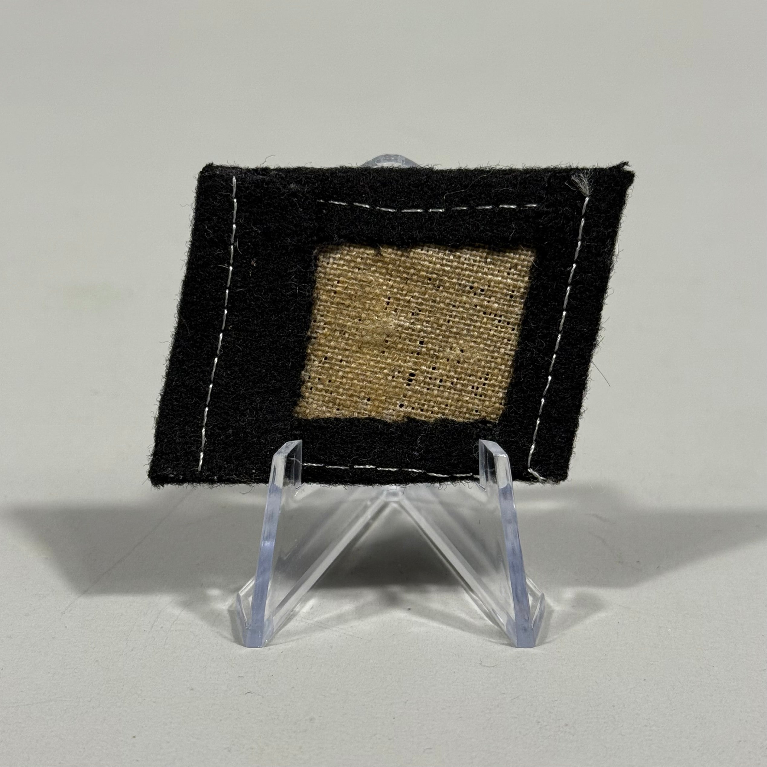 Black wool construction, right hand side, unit designation collar tab features a machine embroidered, fasces in silvery/grey rayon threads with a small, red, thread accent. The collar tab is mounted on a tan buckram backing. The collar tab is in overall excellent condition.