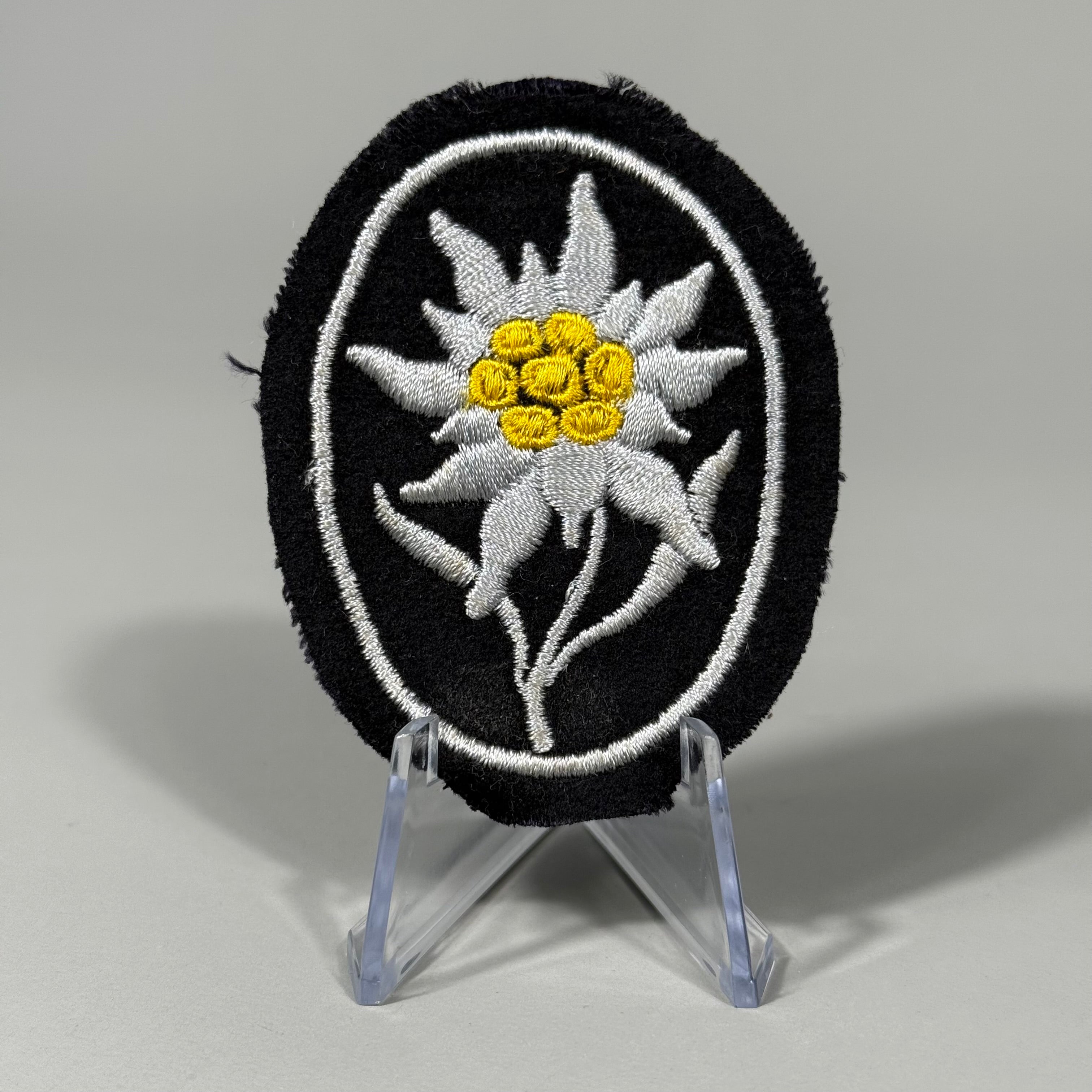 Black wool serves as the base, adorned with a machine-embroidered Edelweiss. This Edelweiss features fourteen irregular silver/grey petals, a seven-bulb yellow stamen, and dual silver/grey leaves. The stem is also silver/grey. All these elements are crafted using rayon threads. The Edelweiss is encircled by a fine, machine-embroidered silver/grey cotton oval outer border stripe.