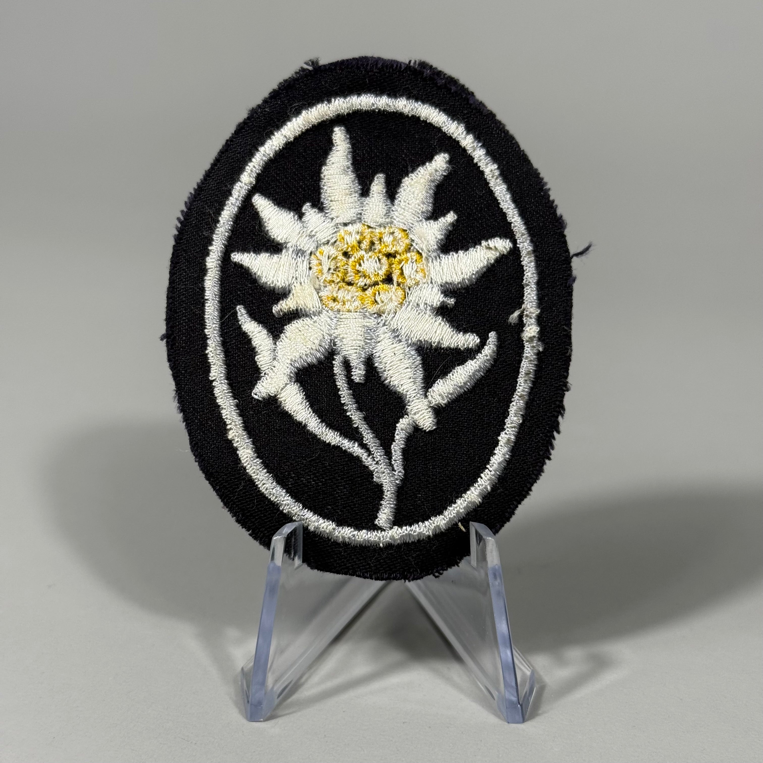 During World War II, the German army deployed nine Mountain Divisions, along with six Waffen-SS Mountain Divisions. These Mountain Divisions were specially trained and equipped Infantry Divisions. On October 1, 1943, Waffen-SS personnel serving with Mountain troop units were authorized to wear the traditional Edelweiss as an identifying insignia. The Edelweiss insignia was issued in two forms: one for wear on the left side of the Bergmütze (Mountain cap) and another for wear on the upper right sleeve of the greatcoat and tunic. The design of these badges closely resembled the earlier introduced army Edelweiss badges, which were issued on May 2, 1939. Notably, the only differences between the army and SS Edelweiss sleeve badges were in their coloration and the army style Edelweiss featured a simulated mountaineers rope with a piton, while the SS badge had a straight oval ring border.