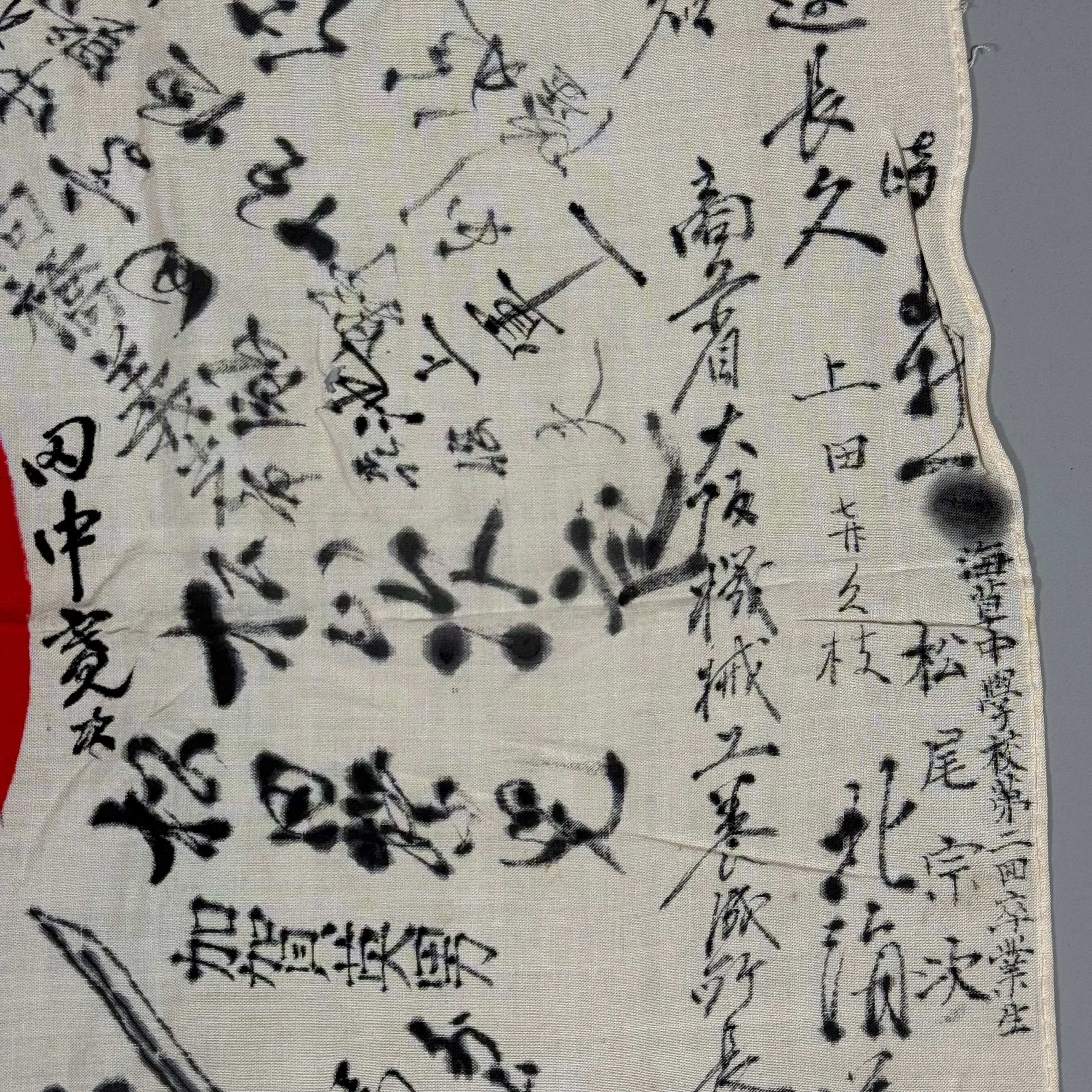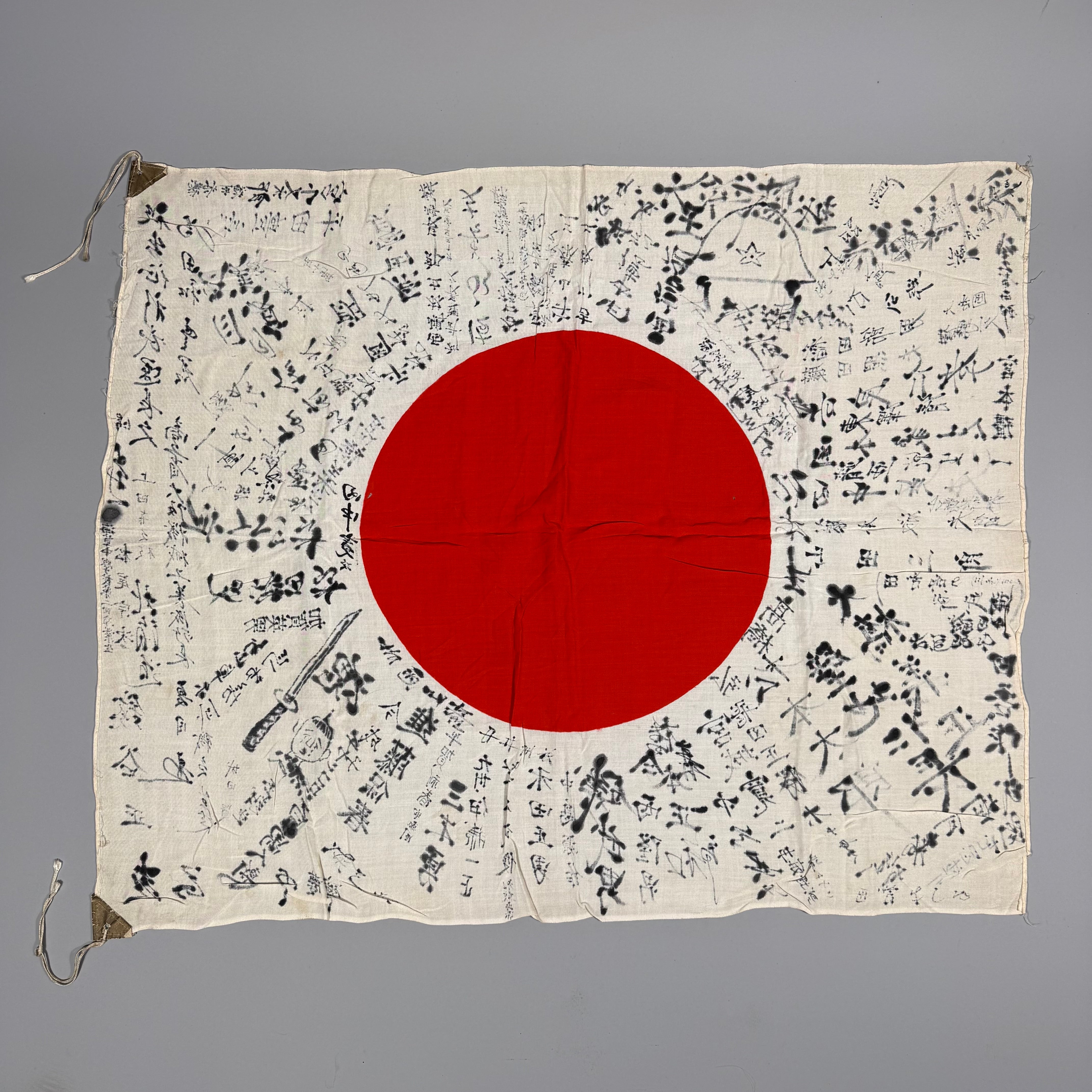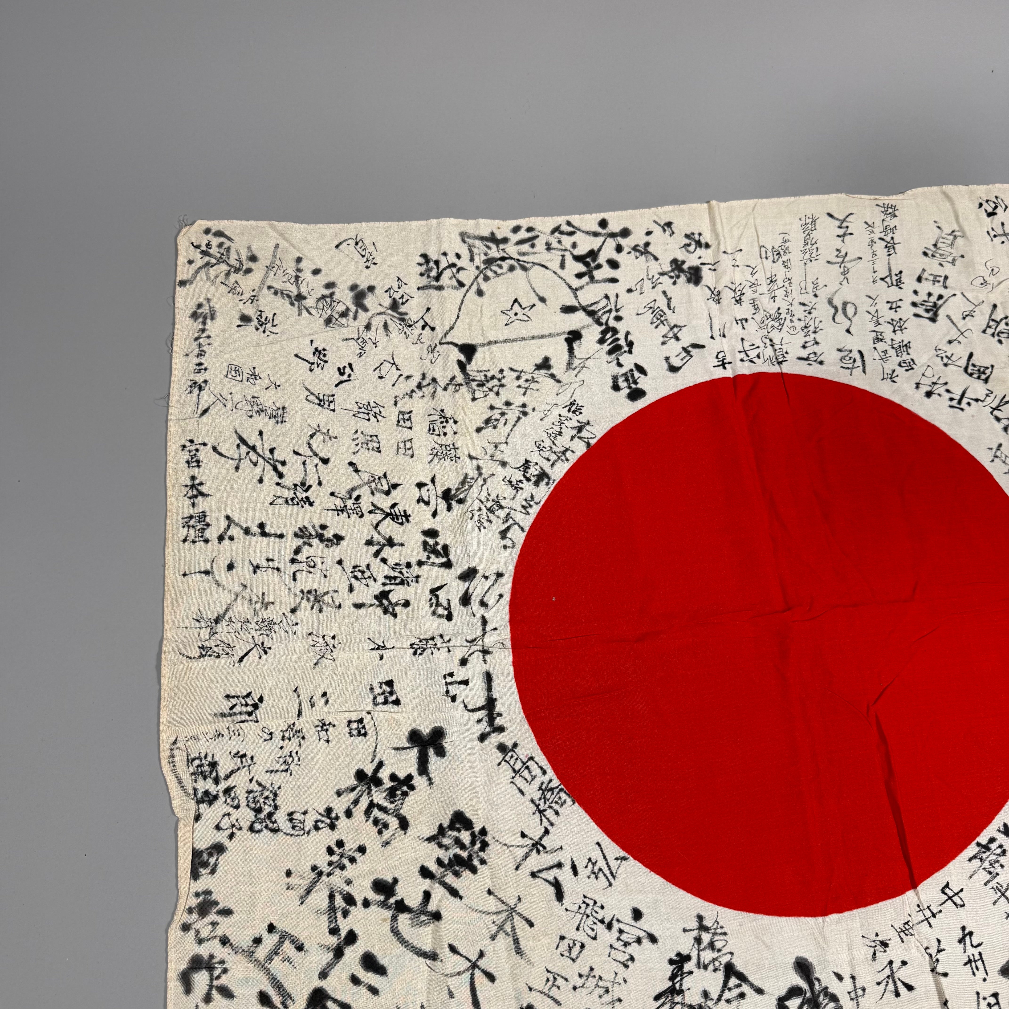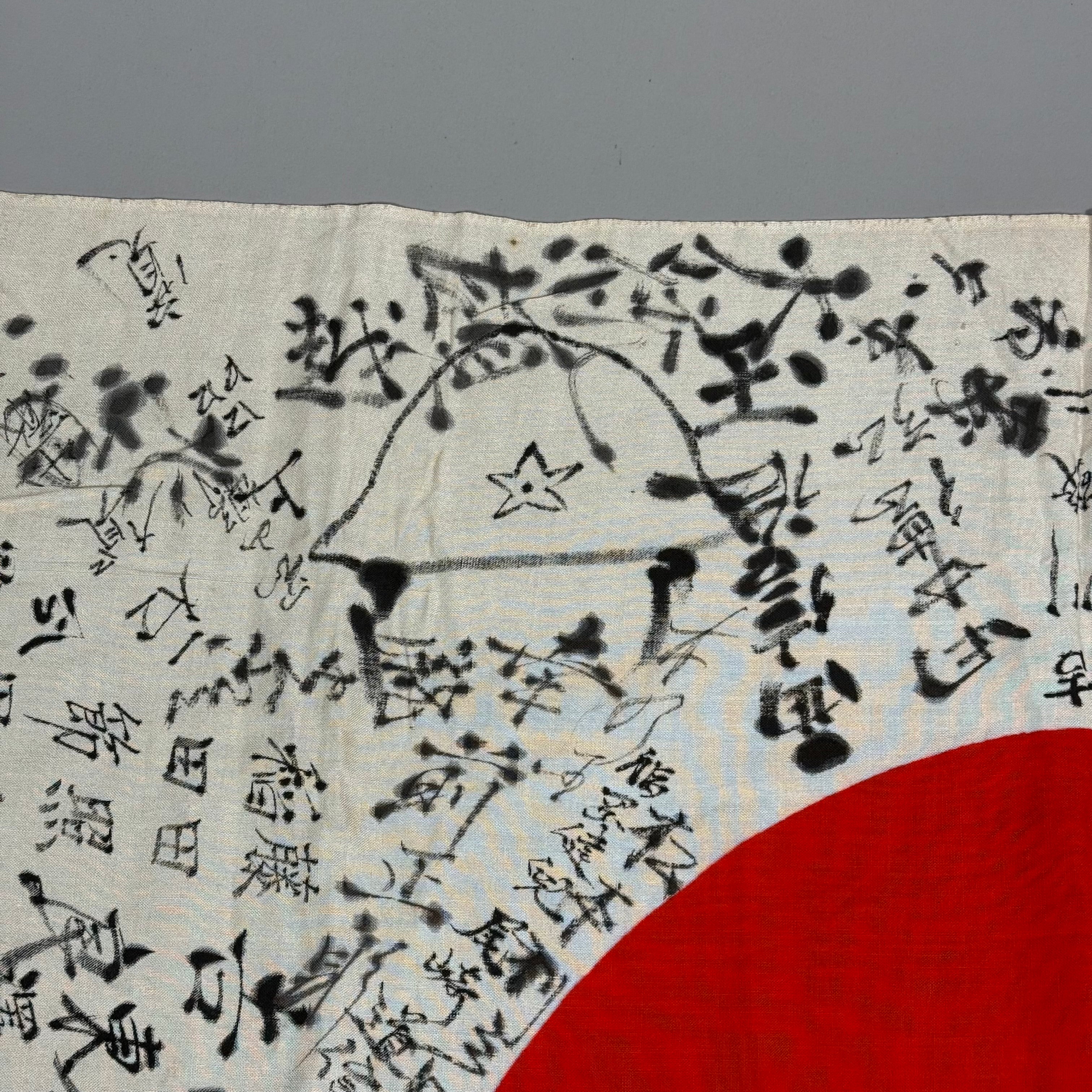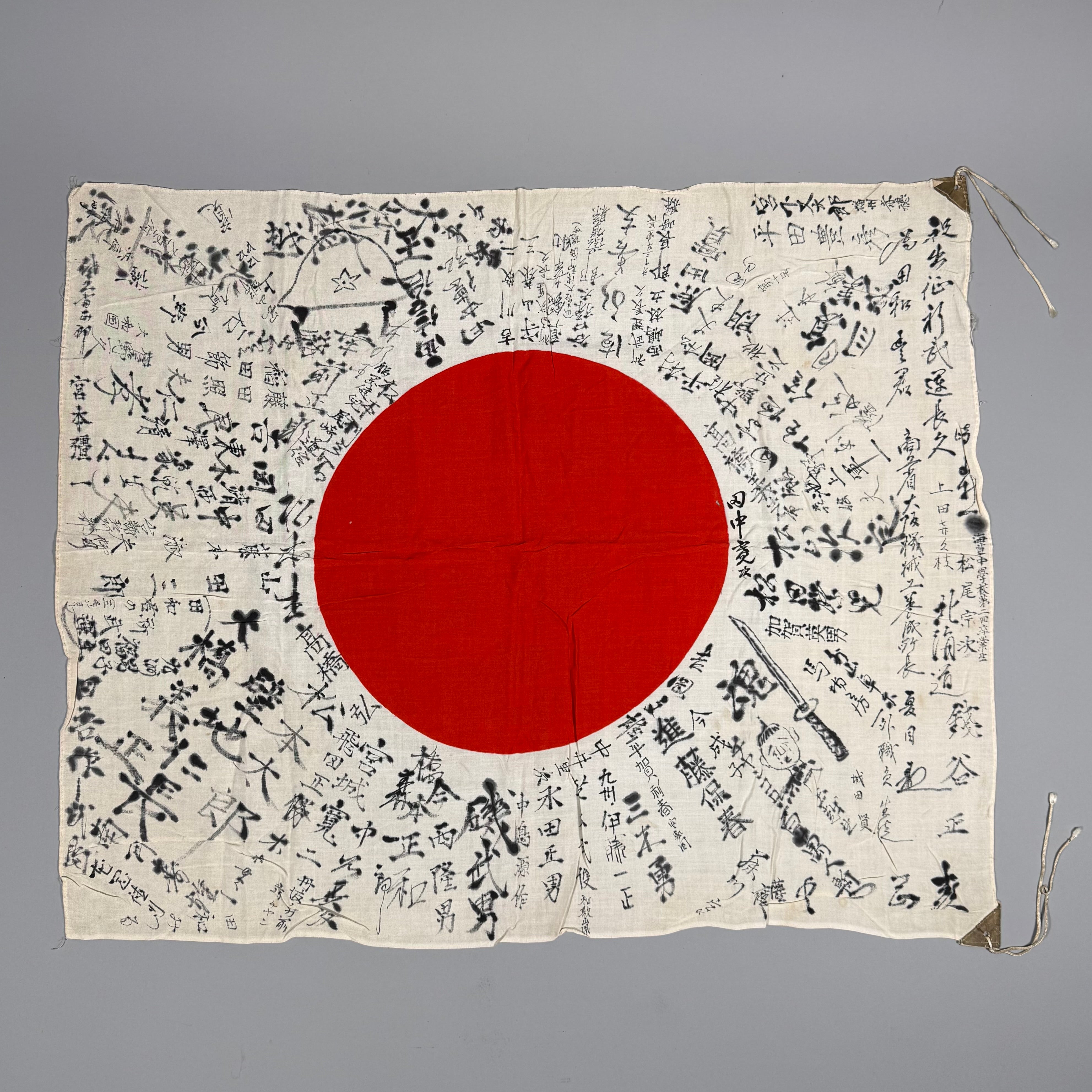 The traditional yosegaki hinomaru was given to men before their induction into the Japanese armed forces or deployment. Friends, family, and colleagues wrote their names, messages, and encouraging words on the flag in a ray-like pattern emanating from the sun. Additional text or drawings were occasionally added, and in rare cases, intricate and impressive art adorned the flag. The writing on the flag was traditionally done using a calligraphy brush and ink. It was customary to only sign around the red center, though some items may have additional characters written on the center in red.