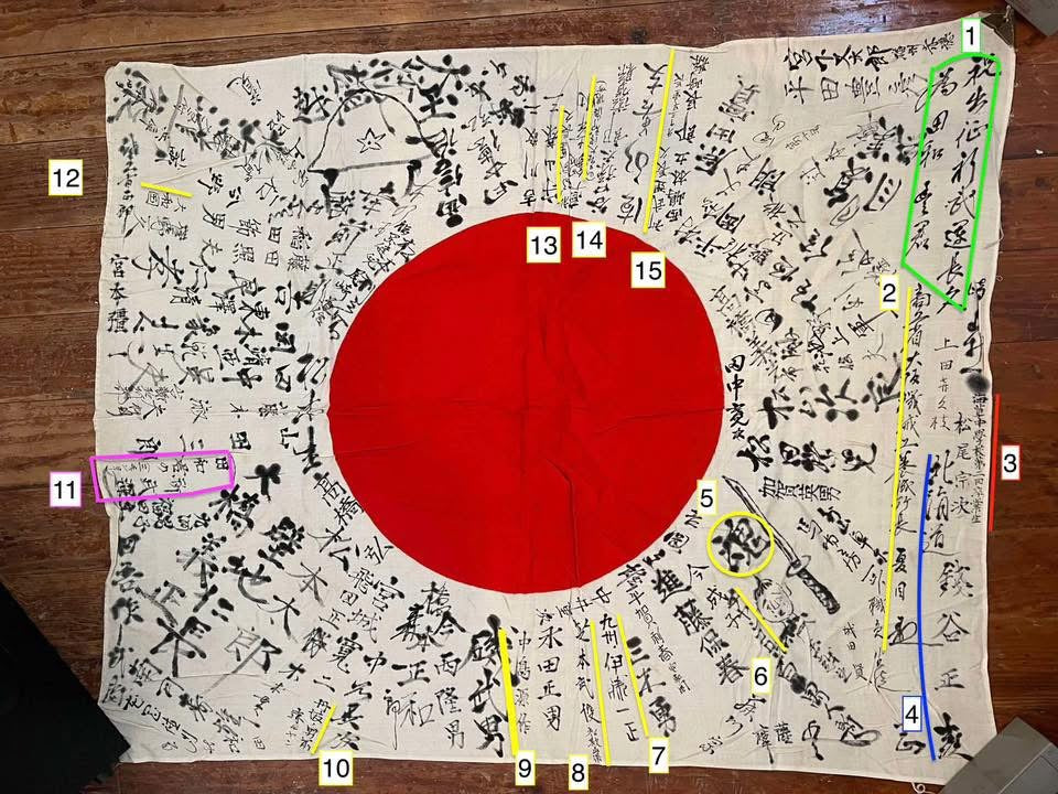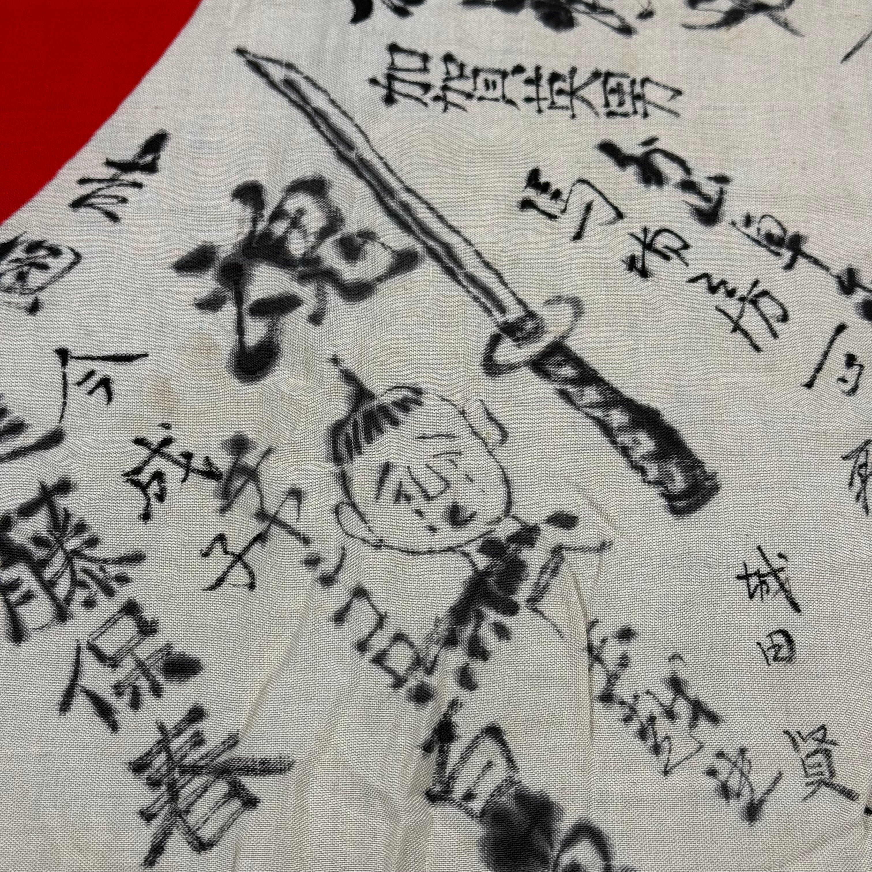 Original World War Two Imperial Japanese Army Yosegaki Hinomaru “Good Luck” Flag featuring a Japanese Type 90 Helmet depiction and a beheaded Chinese soldier with a katana.